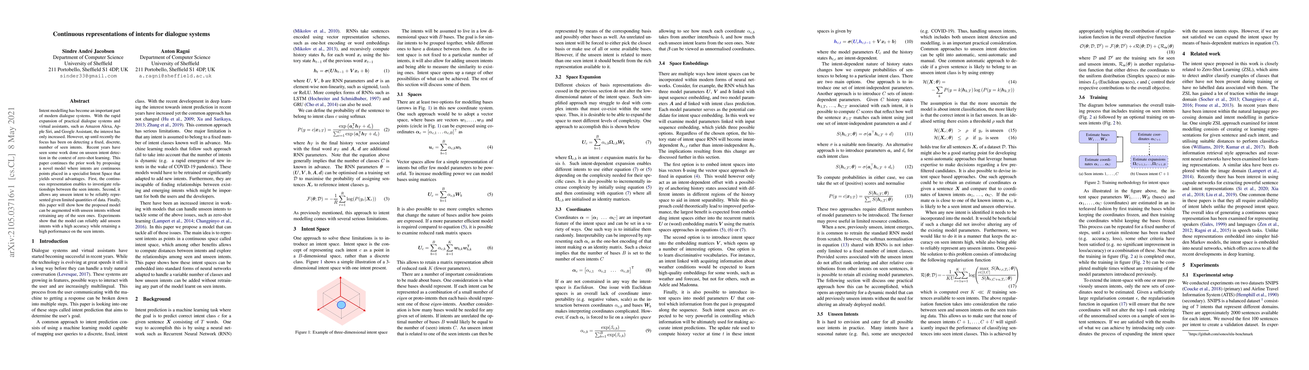 A new model proposes a continuous representation of intents for dialogue systems, enabling analysis of relationships between seen intents and reliable addition of unseen ones with minimal data. This approach improves performance on both seen and unseen intents.