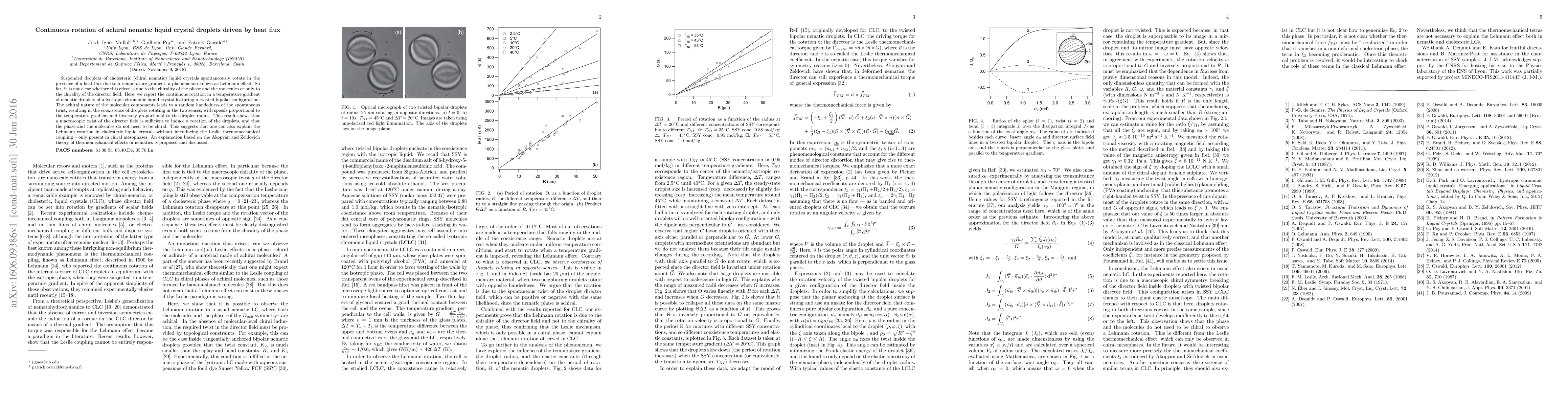 This paper demonstrates continuous rotation of achiral nematic liquid crystal droplets driven by a heat flux, showing that a macroscopic twist of the director field can induce droplet rotation without the need for chiral molecules. This finding suggests an alternative explanation for the Lehmann effect in cholesteric liquid crystals based on thermomechanical effects in nematics.