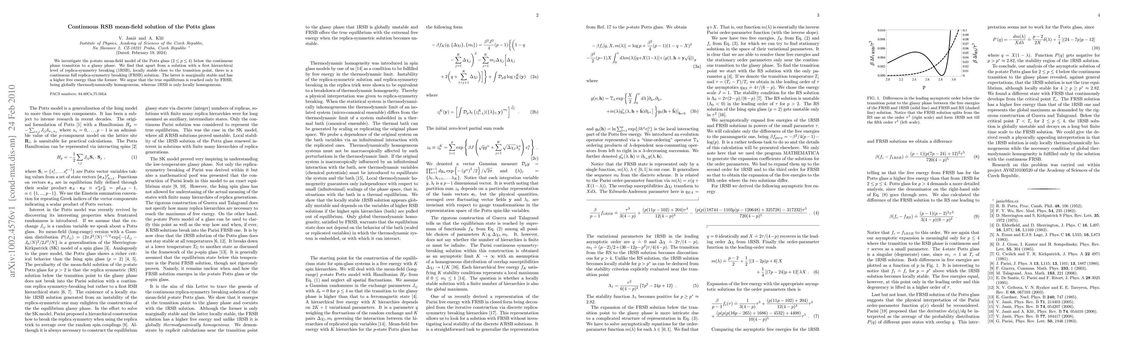 Researchers found a continuous solution for the Potts glass with full replica-symmetry breaking (FRSB), which is marginally stable but globally homogeneous, whereas another solution with 1RSB is locally homogeneous.