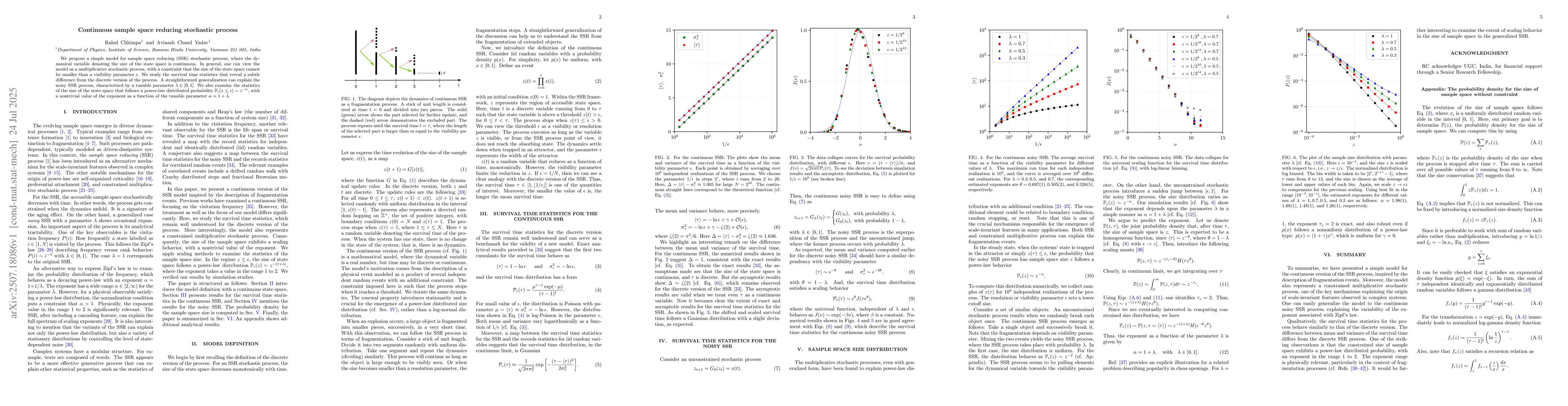 We propose a simple model for sample space reducing (SSR) stochastic process, where the dynamical variable denoting the size of the state space is continuous. In general, one can view the model as a multiplicative stochastic process, with a constraint that the size of the state space cannot be smaller than a visibility parameter $\epsilon$. We study the survival time statistics that reveal a subtle difference from the discrete version of the process. A straightforward generalization can explain the noisy SSR process, characterized by a tunable parameter $\lambda \in [0, 1]$. We also examine the statistics of the size of the state space that follows a power-law distributed probability $\mathbb{P}_{\epsilon}(z\le \epsilon) \sim z^{-\alpha}$, with a nontrivial value of the exponent as a function of the tunable parameter $\alpha = 1+\lambda$.
