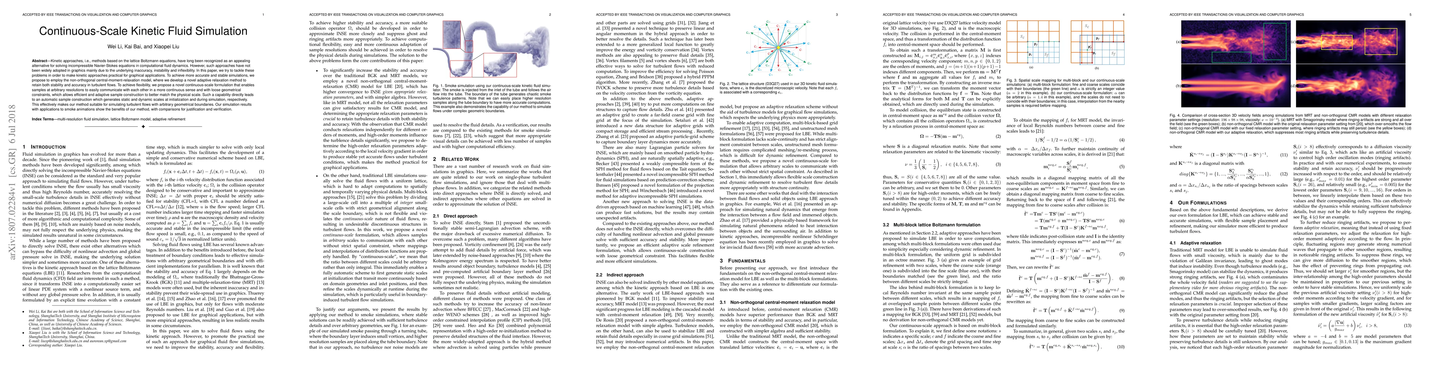 Kinetic approaches, i.e., methods based on the lattice Boltzmann equations, have long been recognized as an appealing alternative for solving incompressible Navier-Stokes equations in computational fluid dynamics. However, such approaches have not been widely adopted in graphics mainly due to the underlying inaccuracy, instability and inflexibility. In this paper, we try to tackle these problems in order to make kinetic approaches practical for graphical applications. To achieve more accurate and stable simulations, we propose to employ the non-orthogonal central-moment-relaxation model, where we develop a novel adaptive relaxation method to retain both stability and accuracy in turbulent flows. To achieve flexibility, we propose a novel continuous-scale formulation that enables samples at arbitrary resolutions to easily communicate with each other in a more continuous sense and with loose geometrical constraints, which allows efficient and adaptive sample construction to better match the physical scale. Such a capability directly leads to an automatic sample construction which generates static and dynamic scales at initialization and during simulation, respectively. This effectively makes our method suitable for simulating turbulent flows with arbitrary geometrical boundaries. Our simulation results with applications to smoke animations show the benefits of our method, with comparisons for justification and verification.