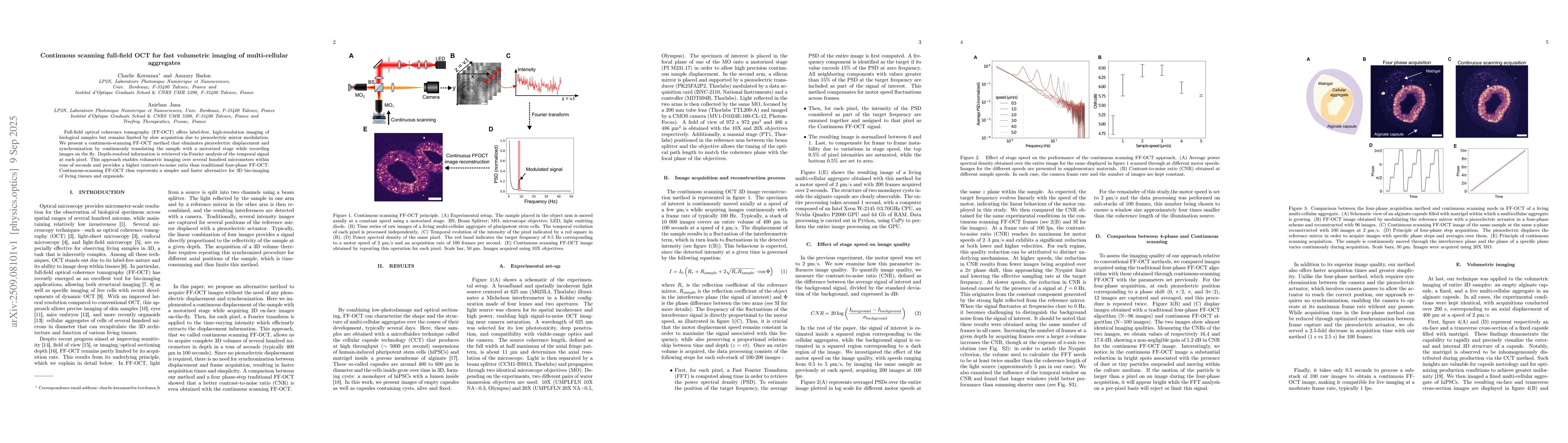 Full-field optical coherence tomography (FF-OCT) offers label-free, high-resolution imaging of biological samples but remains limited by slow acquisition due to piezoelectric mirror modulation. We present a continuous-scanning FF-OCT method that eliminates piezoelectric displacement and synchronization by continuously translating the sample with a motorized stage while recording images on the fly. Depth-resolved information is retrieved via Fourier analysis of the temporal signal at each pixel. This approach enables volumetric imaging over several hundred micrometers within tens of seconds and provides a higher contrast-to-noise ratio than traditional four-phase FF-OCT. Continuous-scanning FF-OCT thus represents a simpler and faster alternative for 3D bio-imaging of living tissues and organoids.