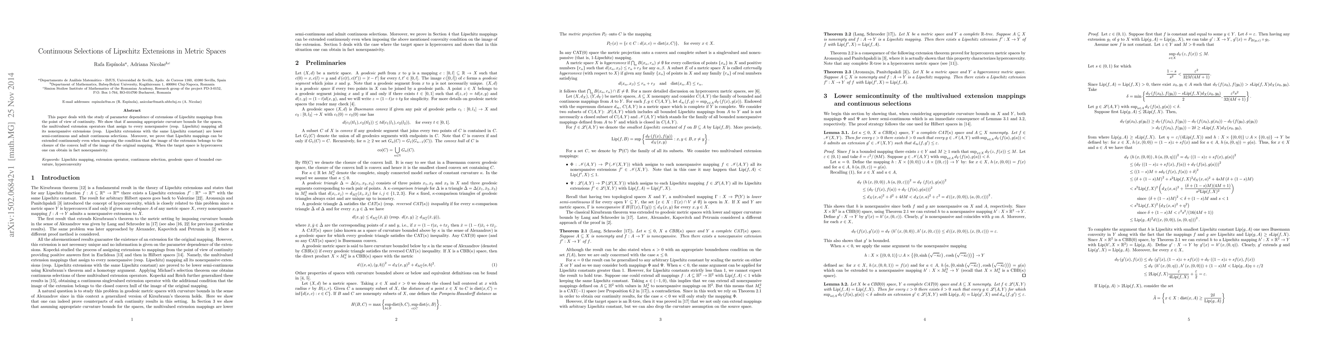 This paper explores the continuous selection of Lipschitz extensions in metric spaces under curvature bounds, proving that multivalued extension operators are lower semi-continuous and admit continuous selections, and that Lipschitz mappings can be extended continuously even with certain convexity conditions. When the target space is hyperconvex, the extended mappings can achieve nonexpansivity.