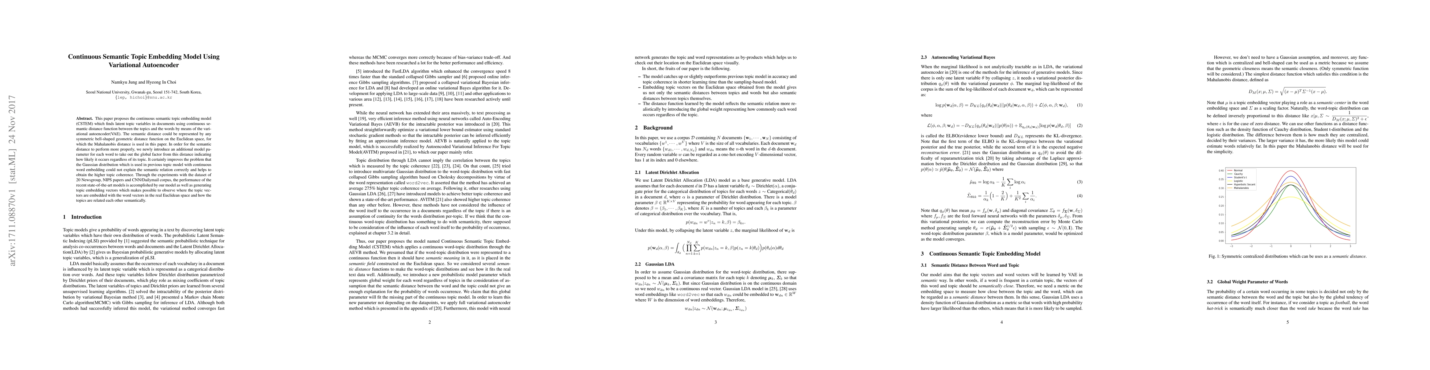 This paper introduces a continuous semantic topic embedding model (CSTEM) using a variational autoencoder to find latent topics in documents, improving semantic distance representation and topic coherence. Experiments show its performance matches state-of-the-art models and provides clear visualization of topic relationships in Euclidean space.