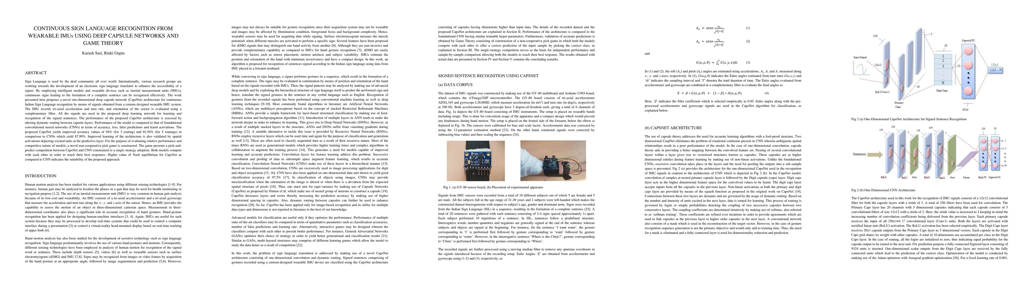 Sign Language is used by the deaf community all over world. The work presented here proposes a novel one-dimensional deep capsule network (CapsNet) architecture for continuous Indian Sign Language recognition by means of signals obtained from a custom designed wearable IMU system. The performance of the proposed CapsNet architecture is assessed by altering dynamic routing between capsule layers. The proposed CapsNet yields improved accuracy values of 94% for 3 routings and 92.50% for 5 routings in comparison with the convolutional neural network (CNN) that yields an accuracy of 87.99%. Improved learning of the proposed architecture is also validated by spatial activations depicting excited units at the predictive layer. Finally, a novel non-cooperative pick-and-predict competition is designed between CapsNet and CNN. Higher value of Nash equilibrium for CapsNet as compared to CNN indicates the suitability of the proposed approach.