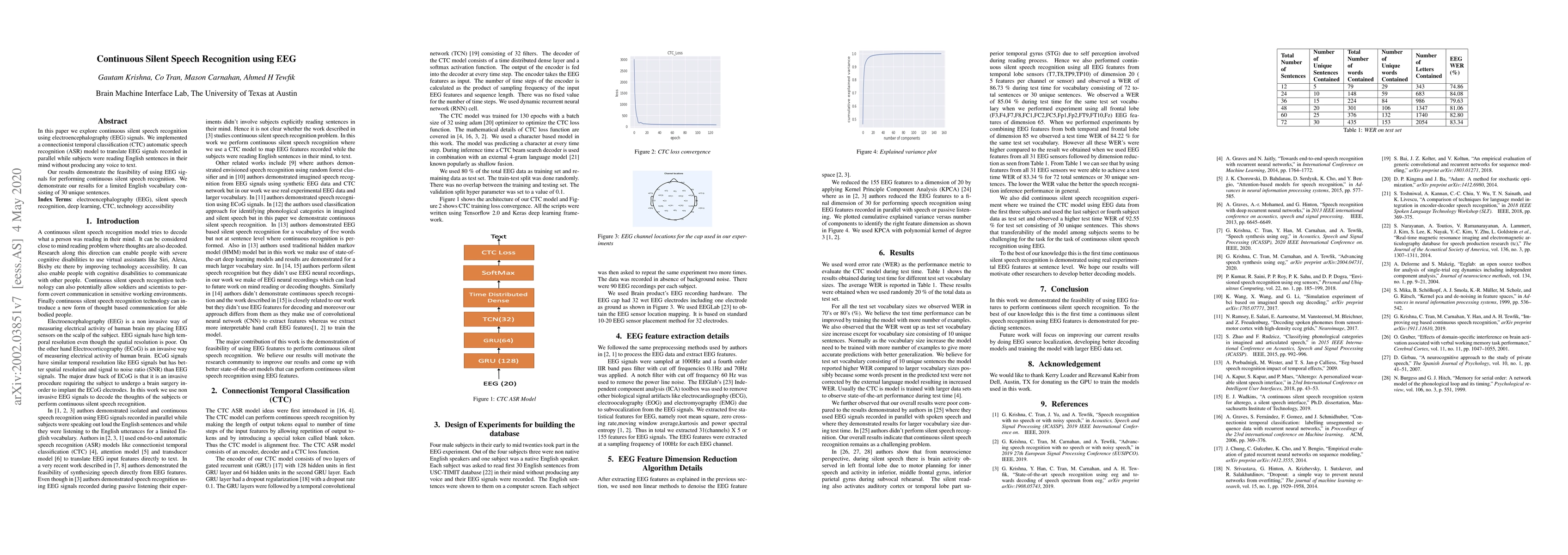 In this paper we explore continuous silent speech recognition using electroencephalography (EEG) signals. We implemented a connectionist temporal classification (CTC) automatic speech recognition (ASR) model to translate EEG signals recorded in parallel while subjects were reading English sentences in their mind without producing any voice to text. Our results demonstrate the feasibility of using EEG signals for performing continuous silent speech recognition. We demonstrate our results for a limited English vocabulary consisting of 30 unique sentences.