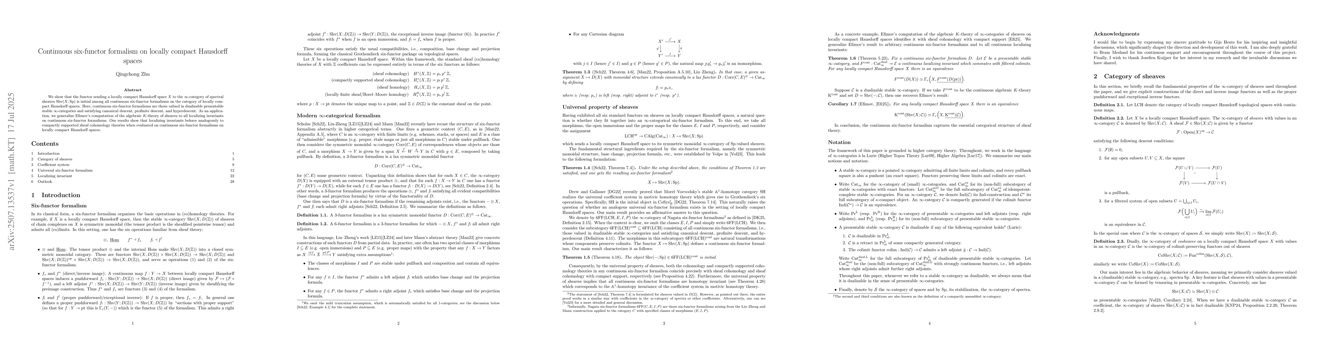 We show that the functor sending a locally compact Hausdorff space $X$ to the $\infty$-category of spectral sheaves $\mathrm{Shv}(X; \mathrm{Sp})$ is initial among all continuous six-functor formalisms on the category of locally compact Hausdorff spaces. Here, continuous six-functor formalisms are those valued in dualizable presentable stable $\infty$-categories and satisfying canonical descent, profinite descent, and hyperdescent. As an application, we generalize Efimov's computation of the algebraic $K$-theory of sheaves to all localizing invariants on continuous six-functor formalisms. Our results show that localizing invariants behave analogously to compactly supported sheaf cohomology theories when evaluated on continuous six-functor formalisms on locally compact Hausdorff spaces.