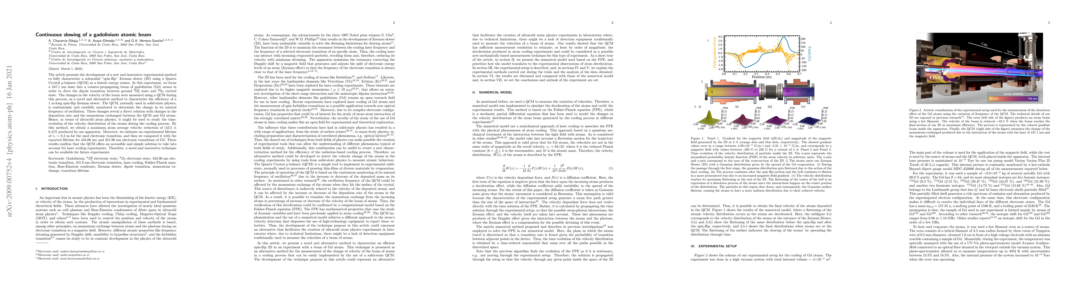The article presents the development of a new and innovative experimental method to fully characterize a solenoidal "spin-flip" Zeeman slower (ZS) using a Quartz Crystal $\mu$-balance (QCM) as a kinetic energy sensor. In this experiment, we focus a 447.1 nm laser into a counter-propagating beam of gadolinium (Gd) atoms in order to drive the dipole transition between ground $^{9}$D$^{0}_{2}$ state and $^{9}$D$_{3}$ excited state. The changes in the velocity of the beam were measured using a QCM during this process, as a novel and alternative method to characterize the efficiency of a 1 m-long spin-flip Zeeman slower. The QCM, normally used in solid-state physics, is continuously and carefully monitored to determine the change in its natural frequency of oscillation. These changes reveal a direct relation with changes in the deposition rate and the momentum exchanged between the QCM and Gd atoms. Hence, in terms of ultracold atom physics, it might be used to study the time-evolution of the velocity distribution of the atoms during the cooling process. By this method, we obtain a maximum atom average velocity reduction of (43.5 $\pm$ 6.4)$\%$ produced by our apparatus. Moreover, we estimate an experimental lifetime of $\tau_{e}$ = 8.2 ns for the used electronic transition, and then we compared it with the reported lifetime for 443.06 nm and 451.96 nm electronic transitions of Gd. These results confirm that the QCM offers an accessible and simple solution to take into account for laser cooling experiments. Therefore, a novel and innovative technique can be available for future experiments.