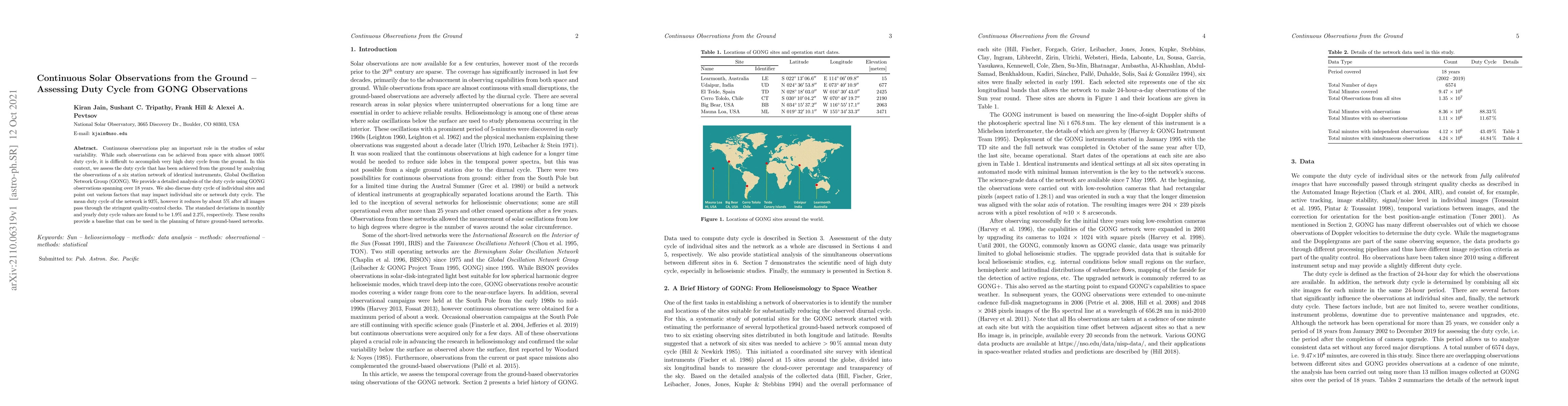 This paper assesses the duty cycle of continuous solar observations from the ground using the GONG network, finding a mean network duty cycle of 93% over 18 years, which drops to 88% post-quality checks. It highlights factors affecting individual site and network duty cycles.