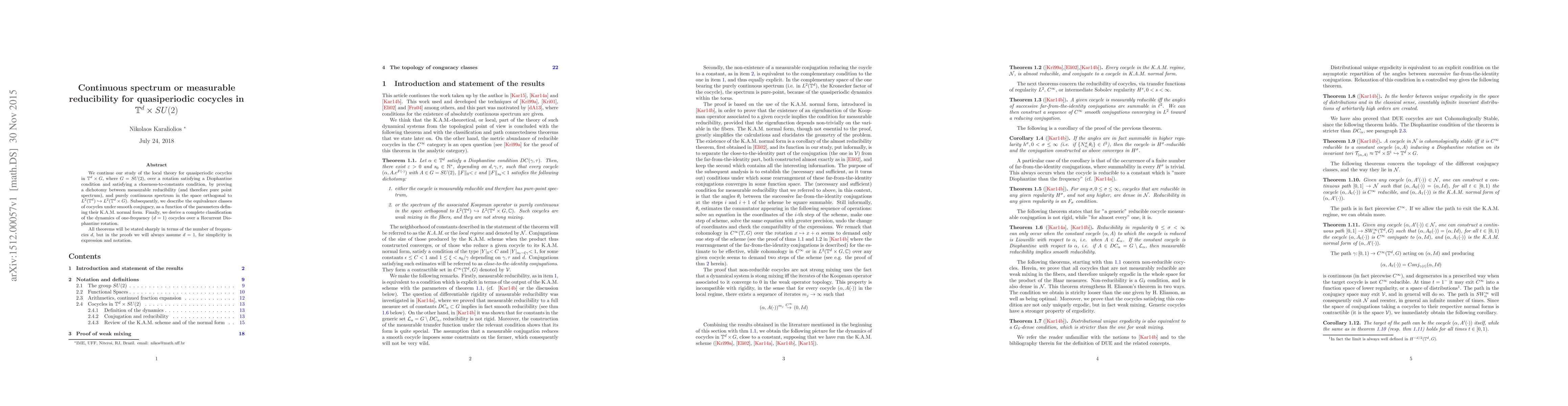 This paper explores the dichotomy between measurable reducibility and purely continuous spectrum for quasiperiodic cocycles in $\mathbb{T}^{d} \times SU(2)$, proving that one leads to pure point spectrum while the other results in continuous spectrum. It also classifies the dynamics of one-frequency cocycles over recurrent Diophantine rotations.