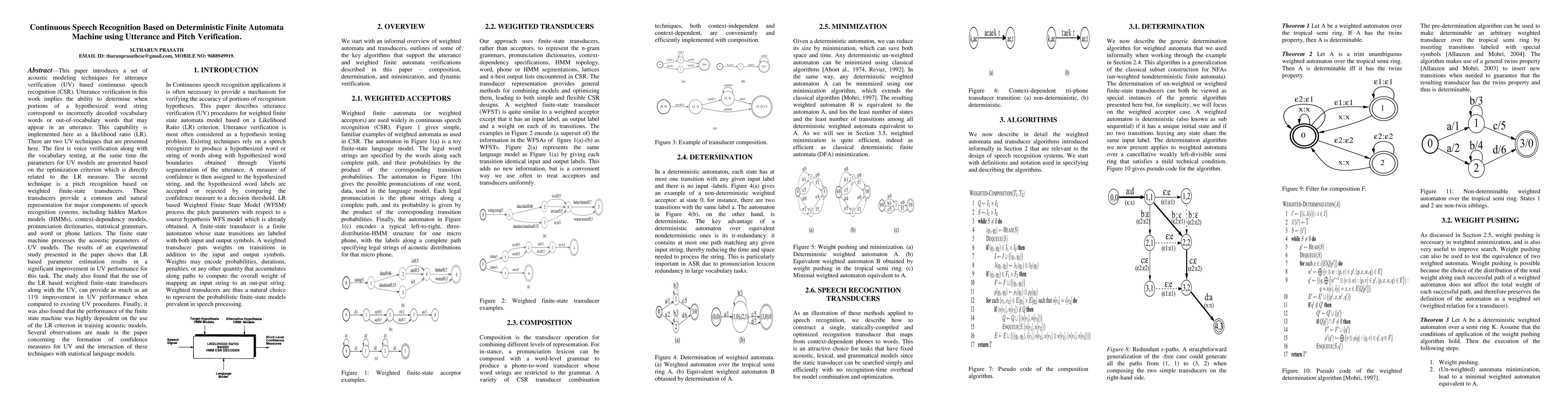 This paper introduces a set of acoustic modeling techniques for utterance verification (UV) based continuous speech recognition (CSR). Utterance verification in this work implies the ability to determine when portions of a hypothesized word string correspond to incorrectly decoded vocabulary words or out-of-vocabulary words that may appear in an utterance. This capability is implemented here as a likelihood ratio (LR). There are two UV techniques that are presented here. The first is voice verification along with the vocabulary testing, at the same time the parameters for UV models are generated based on the optimization criterion which is directly related to the LR measure. The second technique is a pitch recognition based on weighted finite-state transducers. These transducers provide a common and natural representation for major components of speech recognition systems, including hidden Markov models (HMMs), context-dependency models, pronunciation dictionaries, statistical grammars, and word or phone lattices. The finite state machine processes the acoustic parameters of UV models. The results of an experimental study presented in the paper shows that LR based parameter estimation results in a significant improvement in UV performance for this task. The study also found that the use of the LR based weighted finite-state transducers along with the UV, can provide as much as an 11% improvement in UV performance when compared to existing UV procedures. Finally, it was also found that the performance of the finite state machine was highly dependent on the use of the LR criterion in training acoustic models. Several observations are made in the paper concerning the formation of confidence measures for UV and the interaction of these techniques with statistical language models.