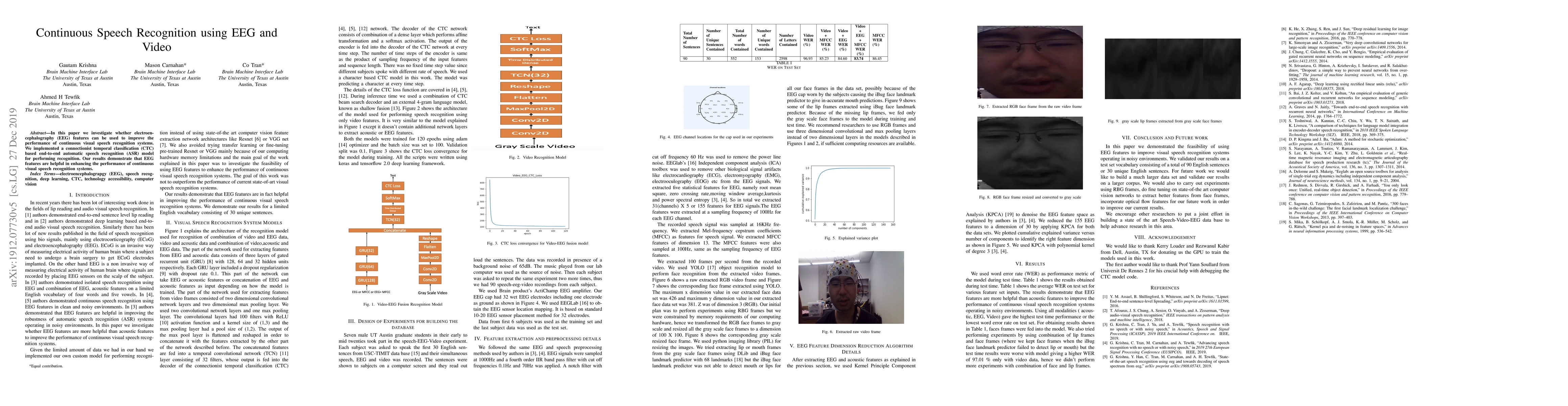 This paper explores the use of EEG features to boost continuous visual speech recognition performance, employing a CTC-based ASR model. Results show that integrating EEG data improves the accuracy of visual speech recognition systems.