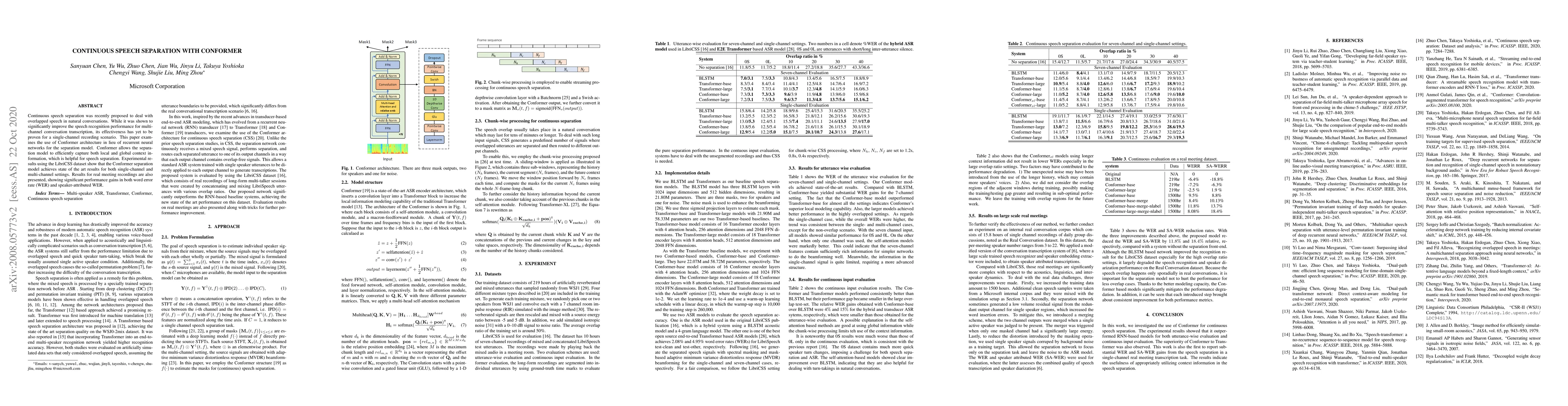 This paper proposes a continuous speech separation model using a conformer instead of recurrent neural networks, achieving state-of-the-art results with a 23.5% reduction in word error rate compared to bi-directional LSTMs in utterance-wise evaluation and a 15.4% reduction in continuous evaluation on the LibriCSS dataset.
