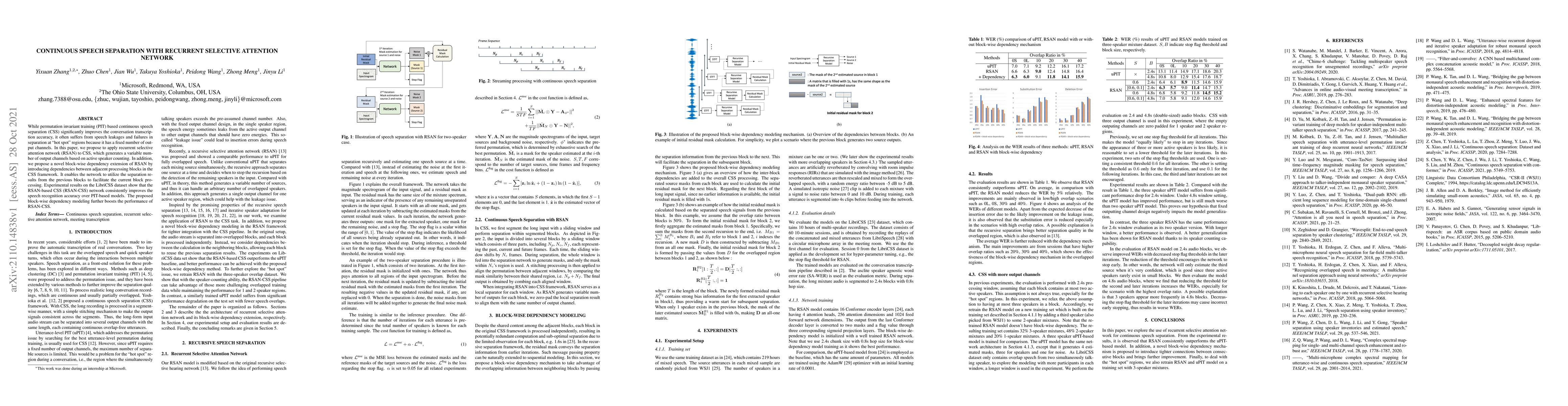 This paper proposes a Recurrent Selective Attention Network (RSAN) for continuous speech separation (CSS) to address speech leakages and failures in separation. The RSAN dynamically adjusts the number of output channels based on active speaker counts, and introduces block-wise dependencies to enhance separation accuracy. Experimental results show that RSAN-based CSS outperforms permutation invariant training models on the LibriCSS dataset.