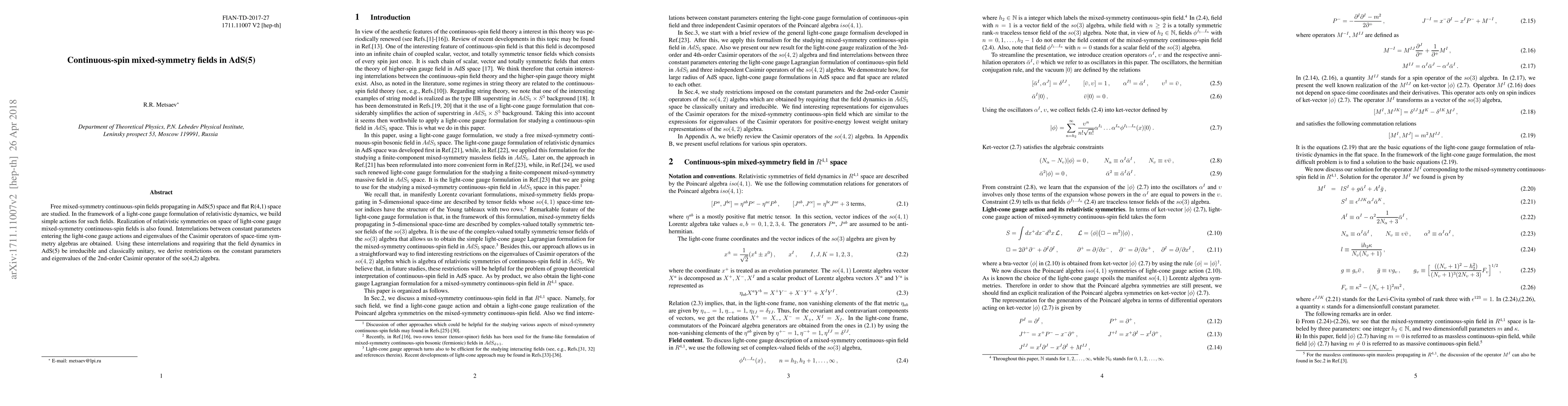 This paper studies free mixed-symmetry continuous-spin fields in AdS(5) and flat R(4,1) spaces, constructing simple light-cone gauge actions and exploring their relativistic symmetries. It derives constraints on parameters and eigenvalues to ensure the dynamics are irreducible and classically unitary.