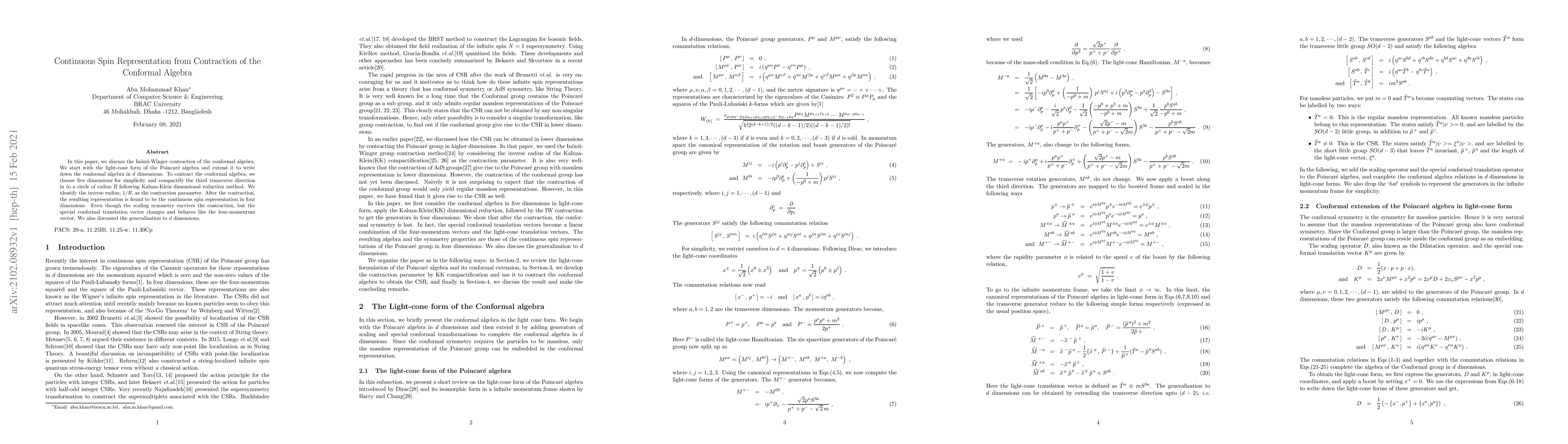 Researchers developed a method to contract the conformal algebra into a continuous spin representation in four dimensions, using Kaluza-Klein dimensional reduction.