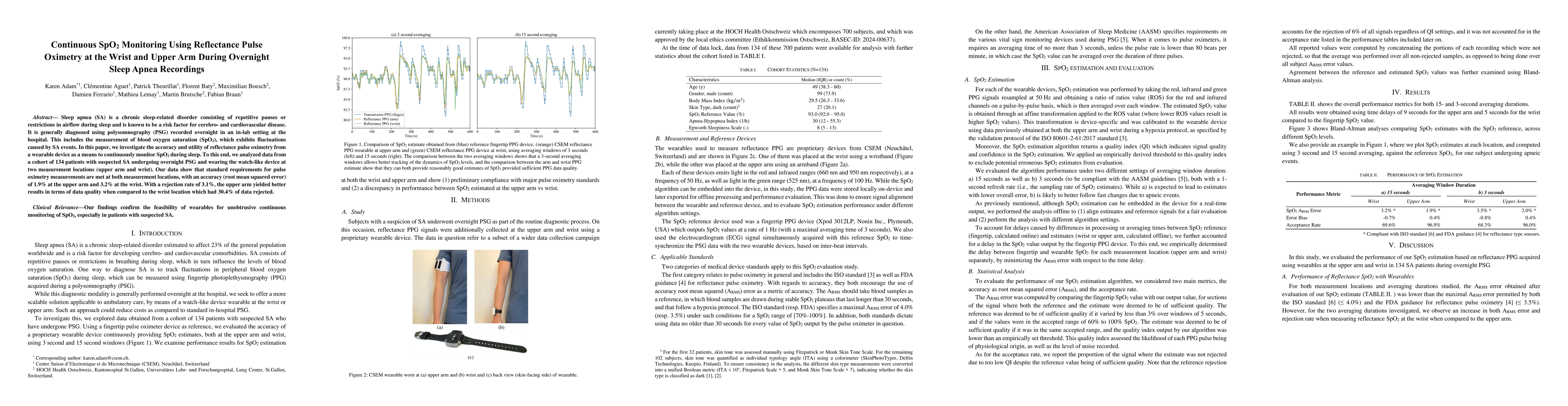 The paper presents an evaluation of a wearable device's accuracy in continuous SpO2 monitoring during sleep apnea recordings at both the upper arm and wrist.