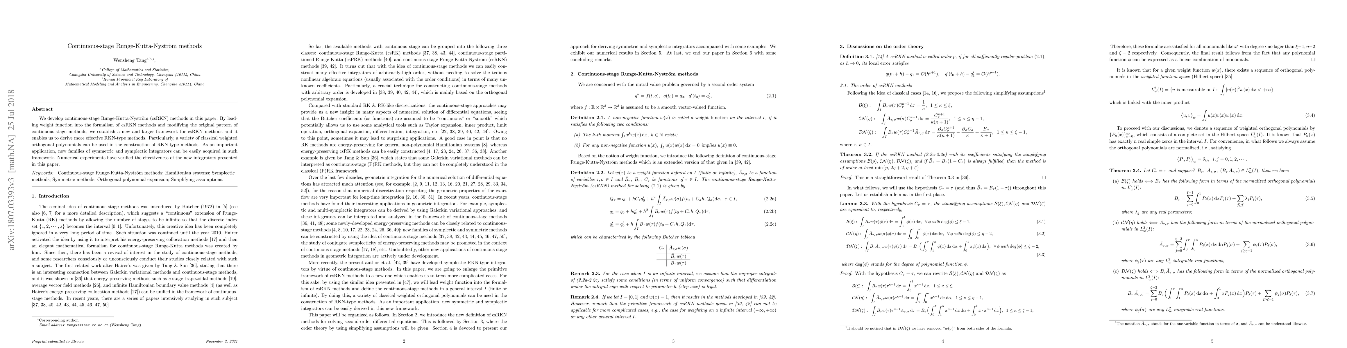We develop continuous-stage Runge-Kutta-Nystr\"Om (csRKN) methods in this paper. By leading weight function into the formalism of csRKN methods and modifying the original pattern of continuous-stage methods, we establish a new and larger framework for csRKN methods and it enables us to derive more effective RKN-type methods. Particularly, a variety of classical weighted orthogonal polynomials can be used in the construction of RKN-type methods. As an important application, new families of symmetric and symplectic integrators can be easily acquired in such framework. Numerical experiments have verified the effectiveness of the new integrators presented in this paper.