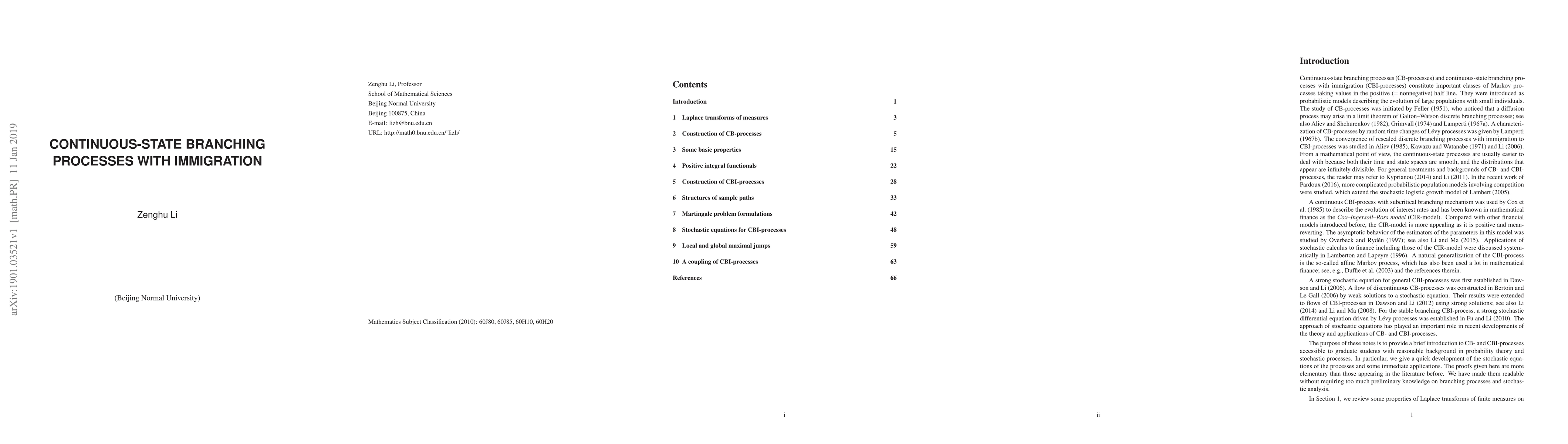 This paper introduces continuous-state branching processes (CB-processes) and branching processes with immigration (CBI-processes), providing accessible, elementary proofs for graduate students. It develops stochastic equations and applications, constructs CB-processes from Galton-Watson limits, and proves strong Feller property and exponential ergodicity for CBI-processes.