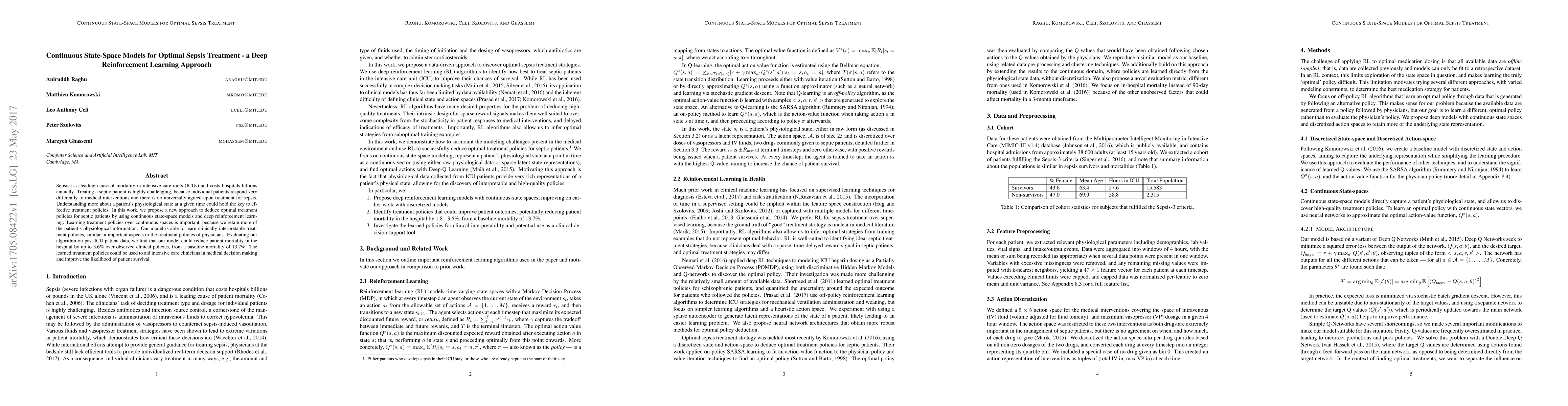 This paper proposes a deep reinforcement learning approach using continuous state-space models to develop optimal treatment policies for sepsis patients, potentially reducing hospital mortality by up to 3.6%. The model learns clinically interpretable treatment strategies that could assist clinicians in improving patient survival rates.