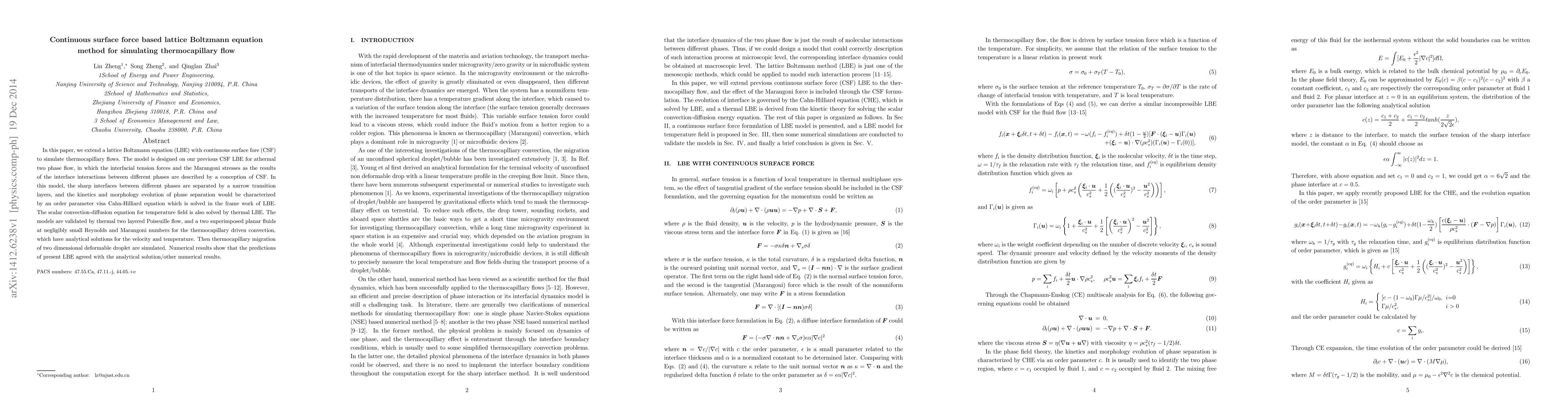 This paper extends a lattice Boltzmann equation (LBE) with continuous surface force (CSF) to simulate thermocapillary flows, incorporating interfacial tension and Marangoni stresses. The model is validated against analytical solutions and simulations of thermocapillary migration of deformable droplets, showing good agreement.