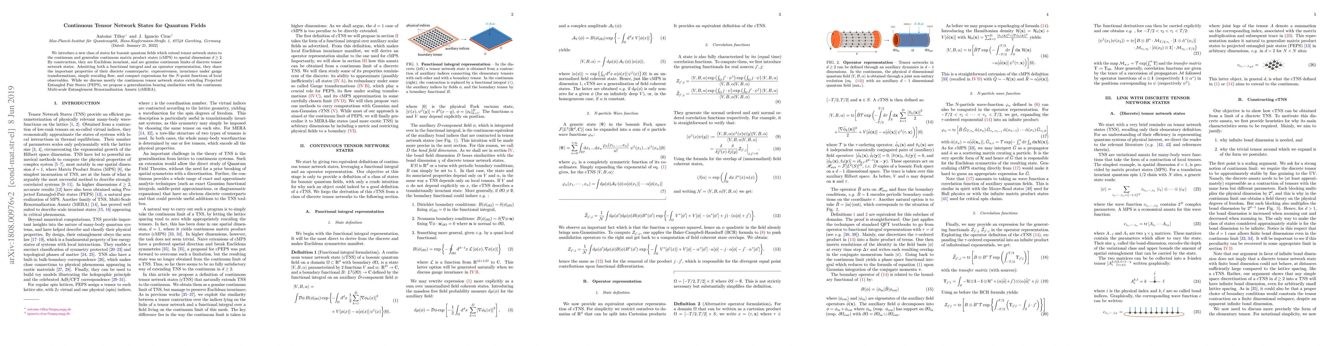 This paper introduces continuous tensor network states for bosonic quantum fields, extending tensor network states to the continuum and generalizing continuous matrix product states to higher dimensions. These states maintain properties like expressiveness, gauge invariance, and compact expressions for $N$-point functions, similar to their discrete tensor network counterparts.