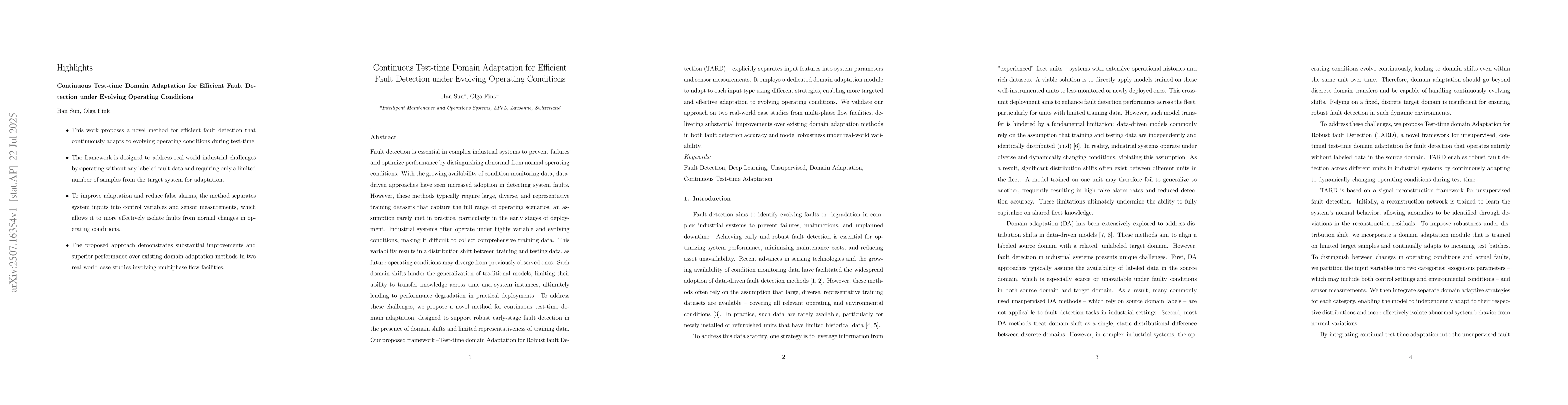 Fault detection is essential in complex industrial systems to prevent failures and optimize performance by distinguishing abnormal from normal operating conditions. With the growing availability of condition monitoring data, data-driven approaches have seen increased adoption in detecting system faults. However, these methods typically require large, diverse, and representative training datasets that capture the full range of operating scenarios, an assumption rarely met in practice, particularly in the early stages of deployment. Industrial systems often operate under highly variable and evolving conditions, making it difficult to collect comprehensive training data. This variability results in a distribution shift between training and testing data, as future operating conditions may diverge from previously observed ones. Such domain shifts hinder the generalization of traditional models, limiting their ability to transfer knowledge across time and system instances, ultimately leading to performance degradation in practical deployments. To address these challenges, we propose a novel method for continuous test-time domain adaptation, designed to support robust early-stage fault detection in the presence of domain shifts and limited representativeness of training data. Our proposed framework --Test-time domain Adaptation for Robust fault Detection (TARD) -- explicitly separates input features into system parameters and sensor measurements. It employs a dedicated domain adaptation module to adapt to each input type using different strategies, enabling more targeted and effective adaptation to evolving operating conditions. We validate our approach on two real-world case studies from multi-phase flow facilities, delivering substantial improvements over existing domain adaptation methods in both fault detection accuracy and model robustness under real-world variability.