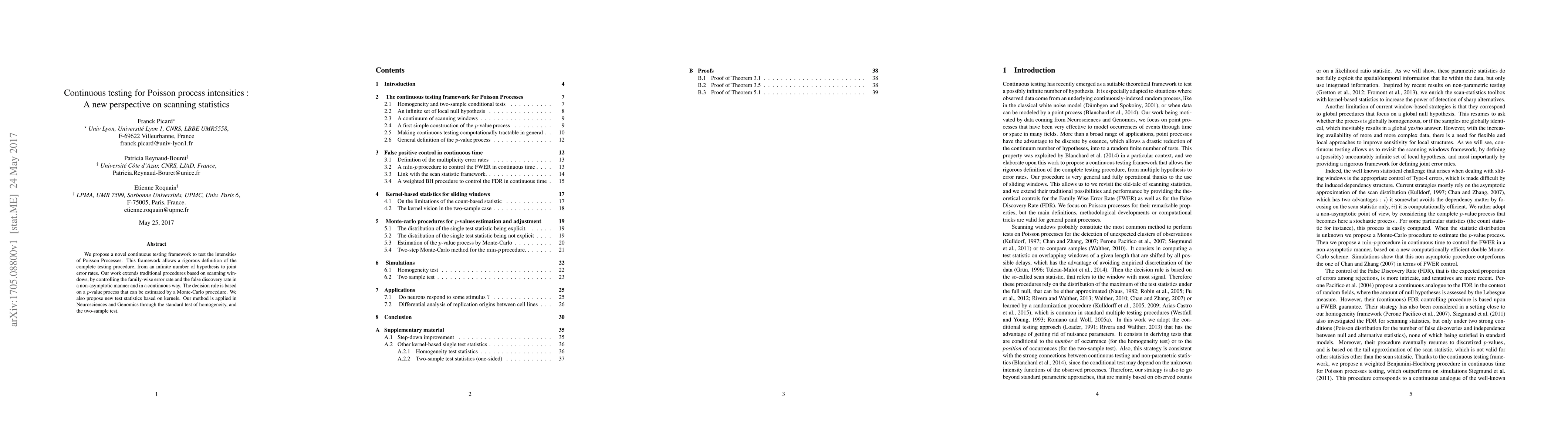 Researchers develop a new framework for testing Poisson process intensities using a continuous scanning statistics approach, controlling error rates and proposing new test statistics based on kernels.
