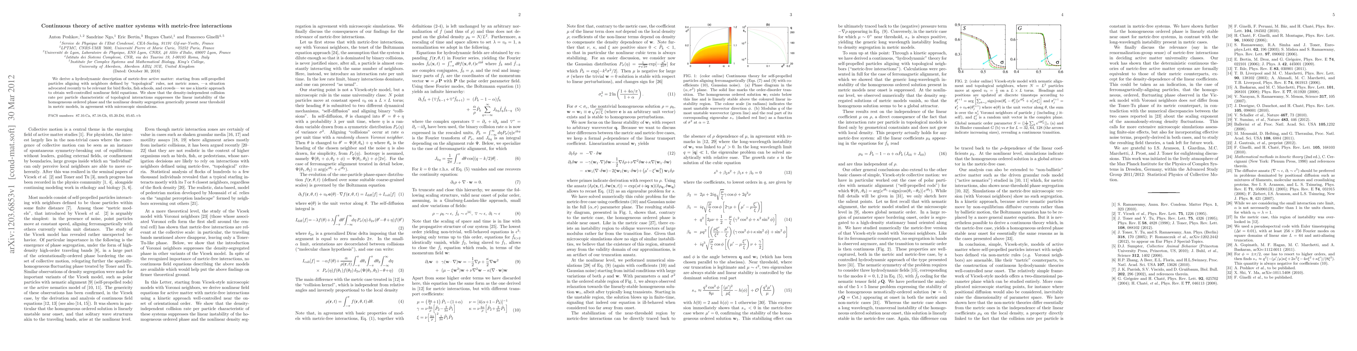 We derive a hydrodynamic description of metric-free active matter: starting from self-propelled particles aligning with neighbors defined by "topological" rules, not metric zones, -a situation advocated recently to be relevant for bird flocks, fish schools, and crowds- we use a kinetic approach to obtain well-controlled nonlinear field equations. We show that the density-independent collision rate per particle characteristic of topological interactions suppresses the linear instability of the homogeneous ordered phase and the nonlinear density segregation generically present near threshold in metric models, in agreement with microscopic simulations.