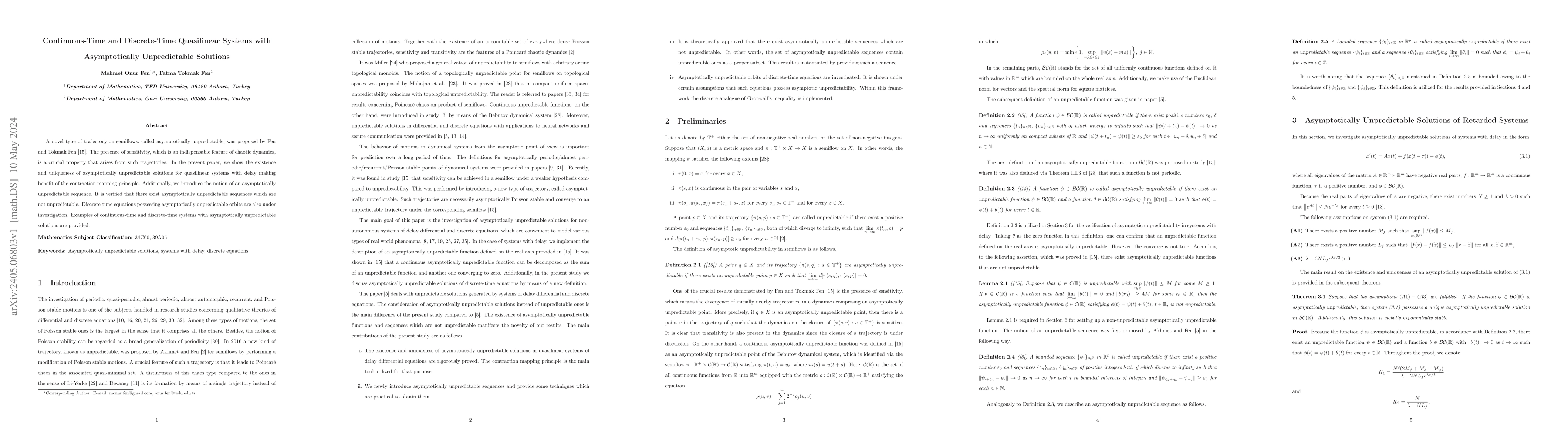 This paper investigates the existence and uniqueness of asymptotically unpredictable solutions in quasilinear systems with delays, leveraging the contraction mapping principle. It introduces the notion of asymptotically unpredictable sequences and provides examples of both continuous-time and discrete-time systems exhibiting such solutions.