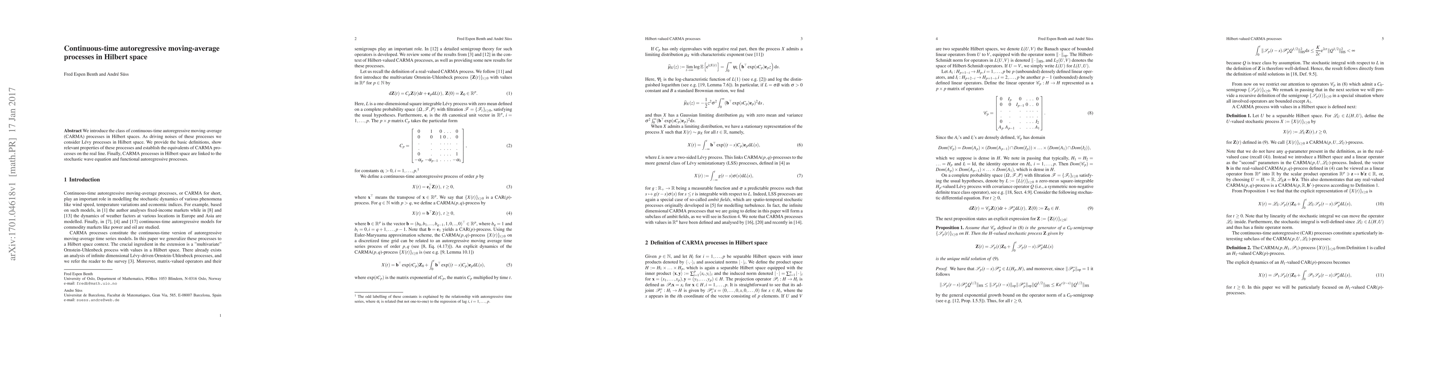 This paper introduces continuous-time autoregressive moving-average (CARMA) processes defined in Hilbert space, driven by Lévy processes, and establishes their properties and equivalences to real-line CARMA processes. It also connects these processes to the stochastic wave equation and functional autoregressive models.