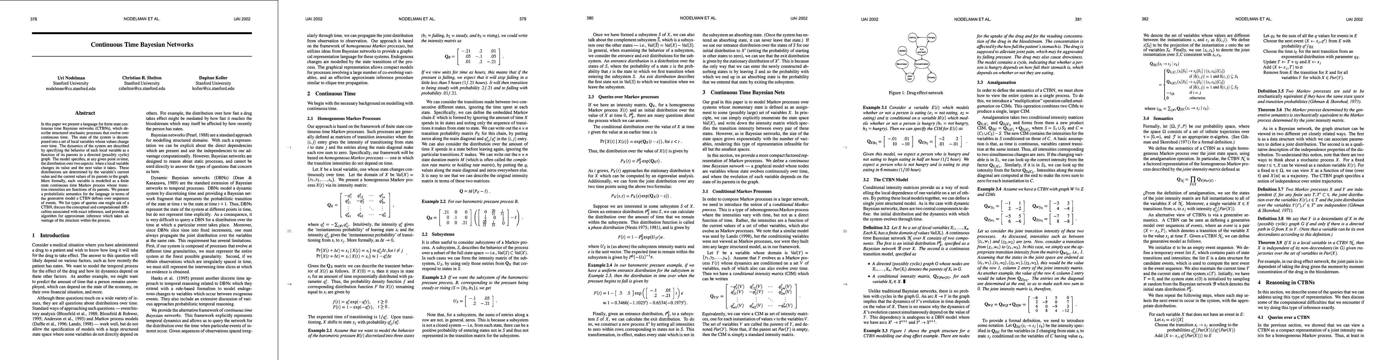 In this paper we present a language for finite state continuous time Bayesian networks (CTBNs), which describe structured stochastic processes that evolve over continuous time. The state of the system is decomposed into a set of local variables whose values change over time. The dynamics of the system are described by specifying the behavior of each local variable as a function of its parents in a directed (possibly cyclic) graph. The model specifies, at any given point in time, the distribution over two aspects: when a local variable changes its value and the next value it takes. These distributions are determined by the variable s CURRENT value AND the CURRENT VALUES OF its parents IN the graph.More formally, each variable IS modelled AS a finite state continuous time Markov process whose transition intensities are functions OF its parents.We present a probabilistic semantics FOR the language IN terms OF the generative model a CTBN defines OVER sequences OF events.We list types OF queries one might ask OF a CTBN, discuss the conceptual AND computational difficulties associated WITH exact inference, AND provide an algorithm FOR approximate inference which takes advantage OF the structure within the process.