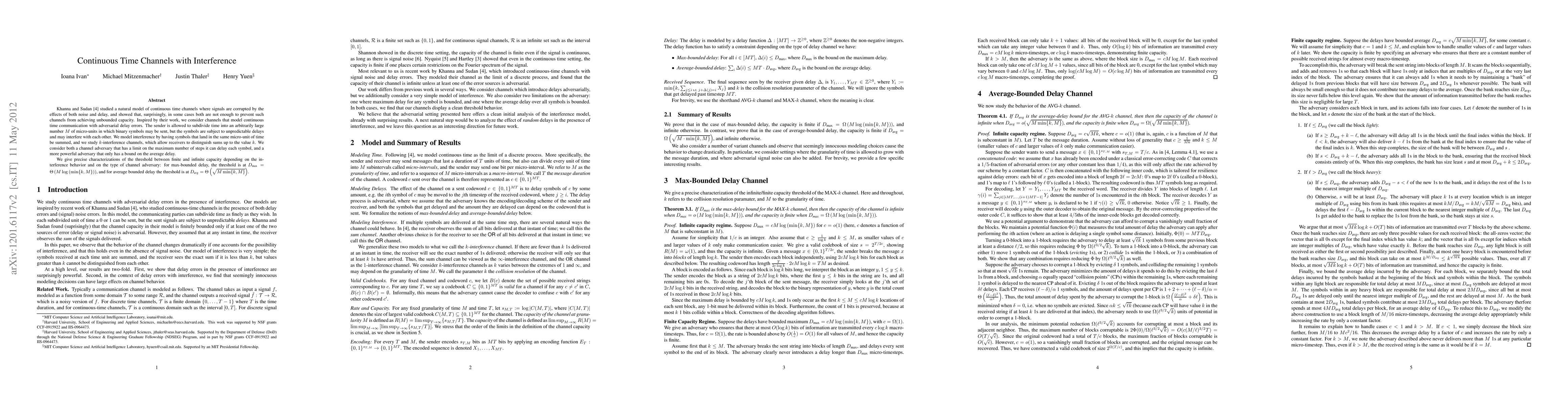 Khanna and Sudan \cite{KS11} studied a natural model of continuous time channels where signals are corrupted by the effects of both noise and delay, and showed that, surprisingly, in some cases both are not enough to prevent such channels from achieving unbounded capacity. Inspired by their work, we consider channels that model continuous time communication with adversarial delay errors. The sender is allowed to subdivide time into an arbitrarily large number $M$ of micro-units in which binary symbols may be sent, but the symbols are subject to unpredictable delays and may interfere with each other. We model interference by having symbols that land in the same micro-unit of time be summed, and we study $k$-interference channels, which allow receivers to distinguish sums up to the value $k$. We consider both a channel adversary that has a limit on the maximum number of steps it can delay each symbol, and a more powerful adversary that only has a bound on the average delay. We give precise characterizations of the threshold between finite and infinite capacity depending on the interference behavior and on the type of channel adversary: for max-bounded delay, the threshold is at $D_{\text{max}}=\ThetaM \log\min{k, M}))$, and for average bounded delay the threshold is at $D_{\text{avg}} = \Theta(\sqrt{M \cdot \min\{k, M\}})$.