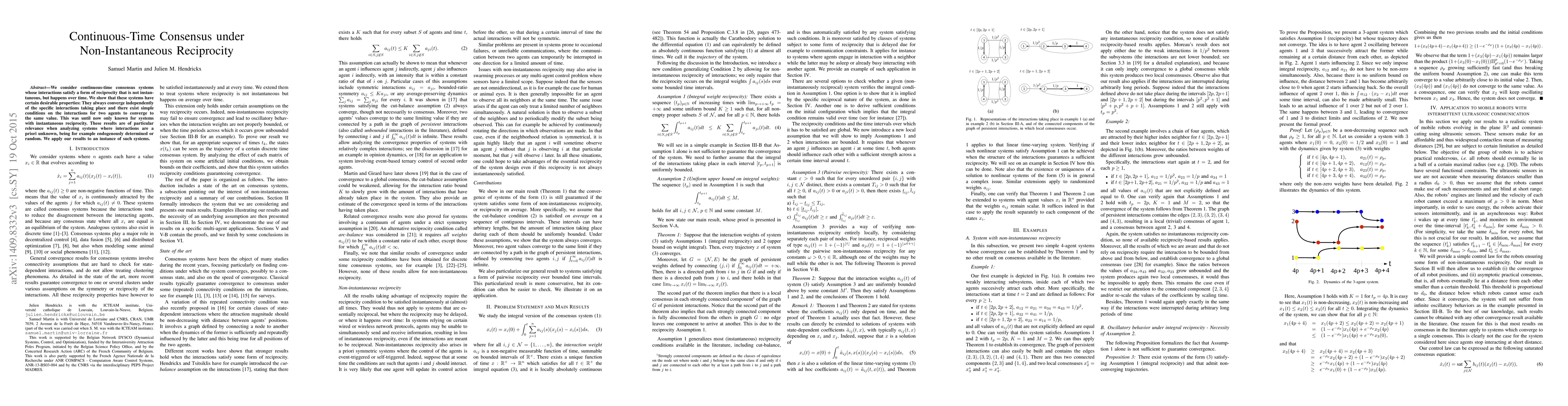 We consider continuous-time consensus systems whose interactions satisfy a form or reciprocity that is not instantaneous, but happens over time. We show that these systems have certain desirable properties: They always converge independently of the specific interactions taking place and there exist simple conditions on the interactions for two agents to converge to the same value. This was until now only known for systems with instantaneous reciprocity. These result are of particular relevance when analyzing systems where interactions are a priori unknown, being for example endogenously determined or random. We apply our results to an instance of such systems.