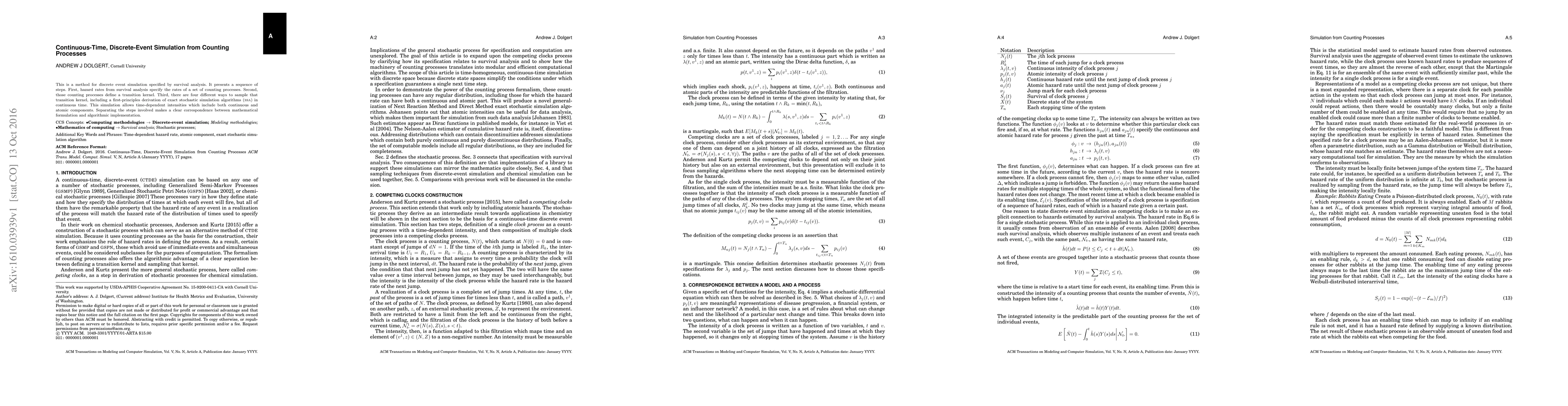 This is a method for discrete event simulation specified by survival analysis. It presents a sequence of steps. First, hazard rates from survival analysis specify the rates of a set of counting processes. Second, those counting processes define a transition kernel. Third, there are four different ways to sample that transition kernel, including a first-principles derivation of exact stochastic simulation algorithms (SSA) in continuous time. This simulation allows time-dependent intensities which include both continuous and atomic components. Separating the steps involved makes a clear correspondence between mathematical formulation and algorithmic implementation.