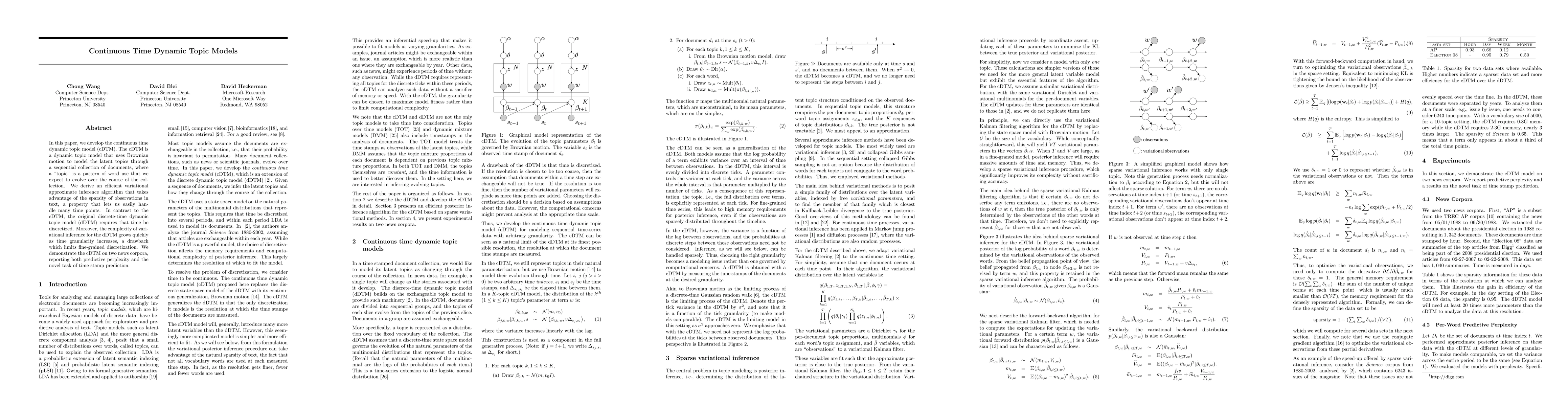 This paper introduces the continuous time dynamic topic model (cDTM), which employs Brownian motion to model evolving topics in text over time. It presents an efficient variational inference algorithm that leverages text sparsity, contrasting with the more complex discrete-time dynamic topic model (dDTM) that requires time discretization.