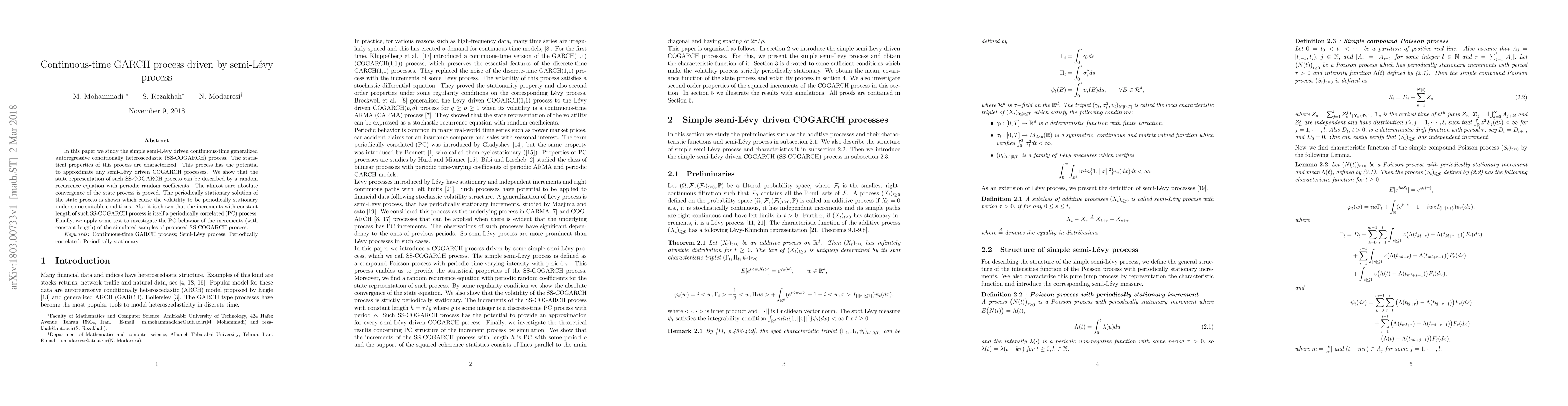 In this paper we study the simple semi-L\'evy driven continuous-time generalized autoregressive conditionally heteroscedastic (SS-COGARCH) process. The statistical properties of this process are characterized. This process has the potential to approximate any semi-L\'evy driven COGARCH processes. We show that the state representation of such SS-COGARCH process can be described by a random recurrence equation with periodic random coefficients. The almost sure absolute convergence of the state process is proved. The periodically stationary solution of the state process is shown which cause the volatility to be periodically stationary under some suitable conditions. Also it is shown that the increments with constant length of such SS-COGARCH process is itself a periodically correlated (PC) process. Finally, we apply some test to investigate the PC behavior of the increments (with constant length) of the simulated samples of proposed SS-COGARCH process.