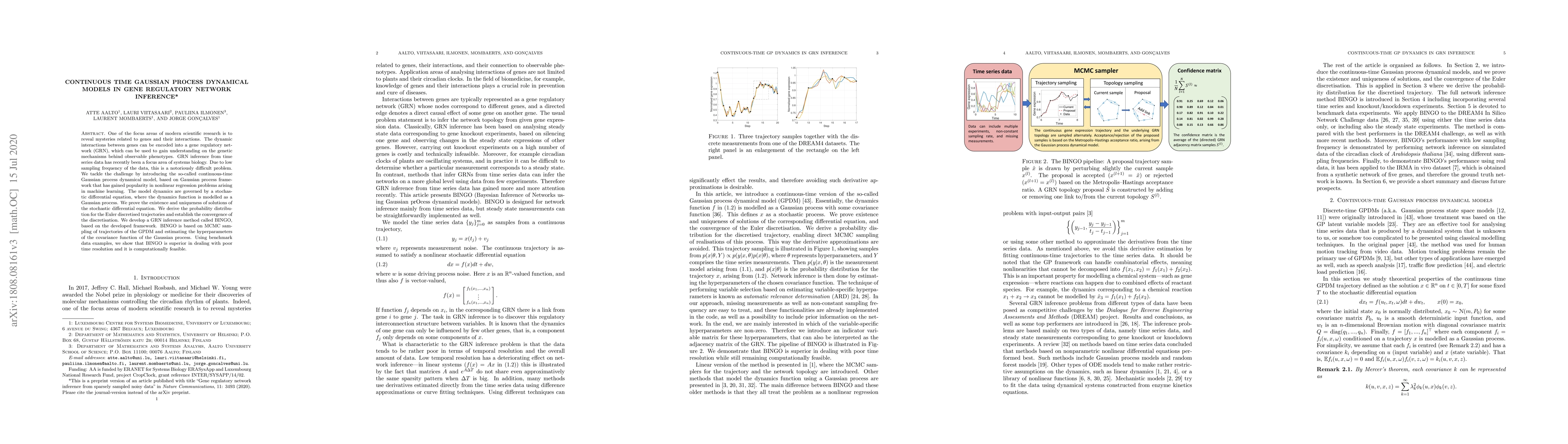 One of the focus areas of modern scientific research is to reveal mysteries related to genes and their interactions. The dynamic interactions between genes can be encoded into a gene regulatory network (GRN), which can be used to gain understanding on the genetic mechanisms behind observable phenotypes. GRN inference from time series data has recently been a focus area of systems biology. Due to low sampling frequency of the data, this is a notoriously difficult problem. We tackle the challenge by introducing the so-called continuous-time Gaussian process dynamical model, based on Gaussian process framework that has gained popularity in nonlinear regression problems arising in machine learning. The model dynamics are governed by a stochastic differential equation, where the dynamics function is modelled as a Gaussian process. We prove the existence and uniqueness of solutions of the stochastic differential equation. We derive the probability distribution for the Euler discretised trajectories and establish the convergence of the discretisation. We develop a GRN inference method called BINGO, based on the developed framework. BINGO is based on MCMC sampling of trajectories of the GPDM and estimating the hyperparameters of the covariance function of the Gaussian process. Using benchmark data examples, we show that BINGO is superior in dealing with poor time resolution and it is computationally feasible.