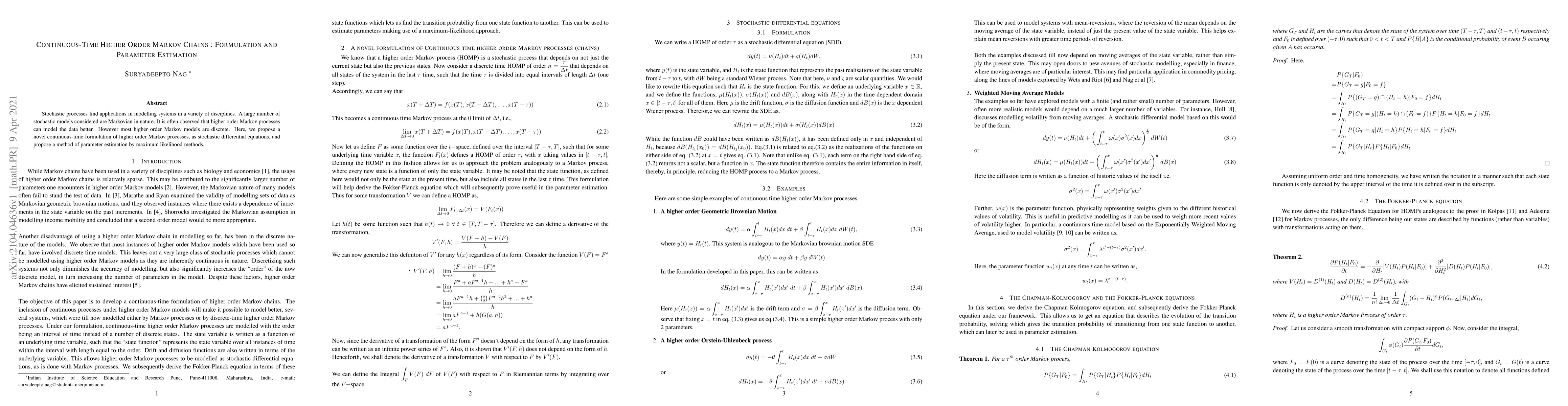 Stochastic processes find applications in modelling systems in a variety of disciplines. A large number of stochastic models considered are Markovian in nature. It is often observed that higher order Markov processes can model the data better. However most higher order Markov models are discrete. Here, we propose a novel continuous-time formulation of higher order Markov processes, as stochastic differential equations, and propose a method of parameter estimation by maximum likelihood methods.