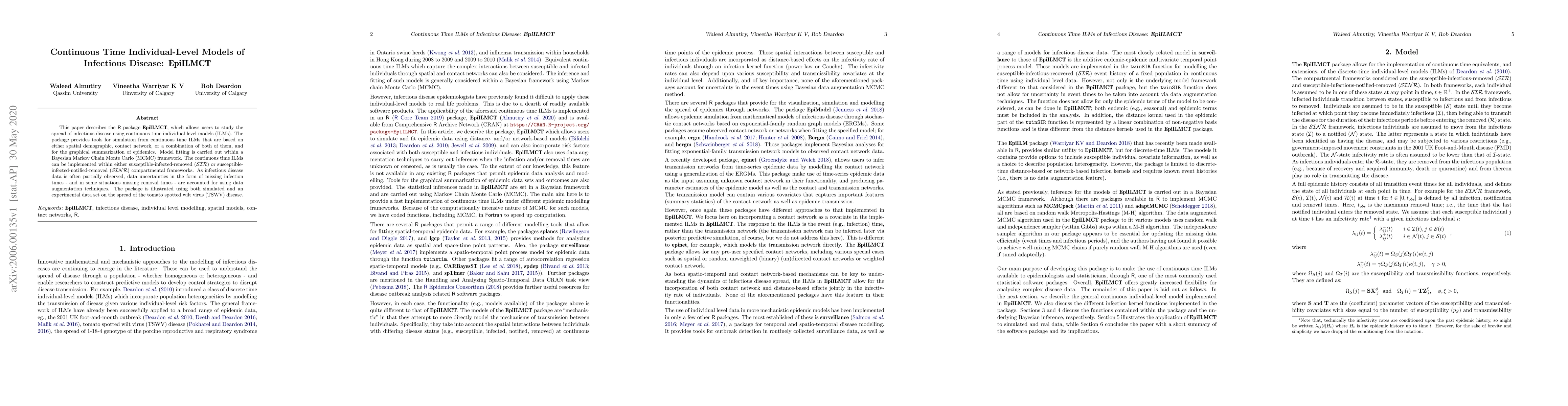 This paper introduces the R package EpiILMCT for simulating and analyzing infectious disease spread using continuous time individual-level models. It employs Bayesian MCMC for model fitting and handles data uncertainties through data augmentation techniques, illustrated with a dataset on the tomato spotted wilt virus.