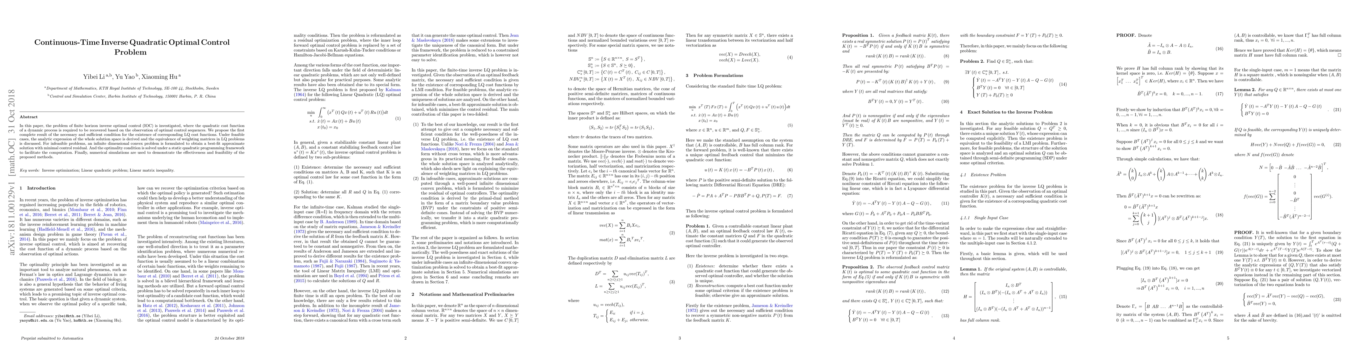 In this paper, the problem of finite horizon inverse optimal control (IOC) is investigated, where the quadratic cost function of a dynamic process is required to be recovered based on the observation of optimal control sequences. We propose the first complete result of the necessary and sufficient condition for the existence of corresponding LQ cost functions. Under feasible cases, the analytic expression of the whole solution space is derived and the equivalence of weighting matrices in LQ problems is discussed. For infeasible problems, an infinite dimensional convex problem is formulated to obtain a best-fit approximate solution with minimal control residual. And the optimality condition is solved under a static quadratic programming framework to facilitate the computation. Finally, numerical simulations are used to demonstrate the effectiveness and feasibility of the proposed methods.