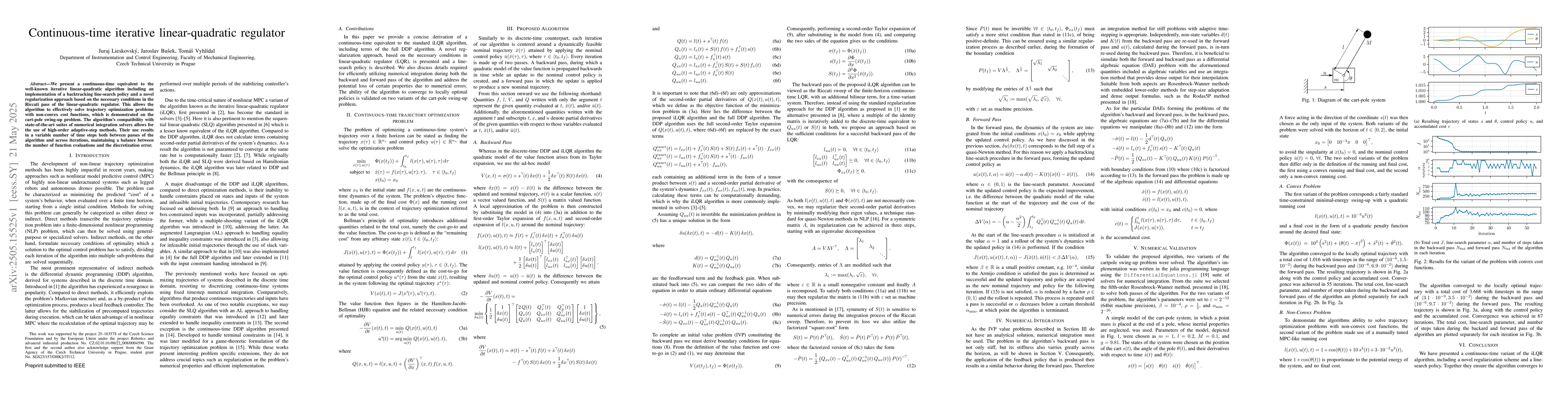 The paper presents a continuous-time iterative linear-quadratic regulator, implementing a backtracking line-search policy and a regularization approach based on Riccati conditions. It demonstrates compatibility with numerical integration solvers, enabling high-order adaptive-step methods.