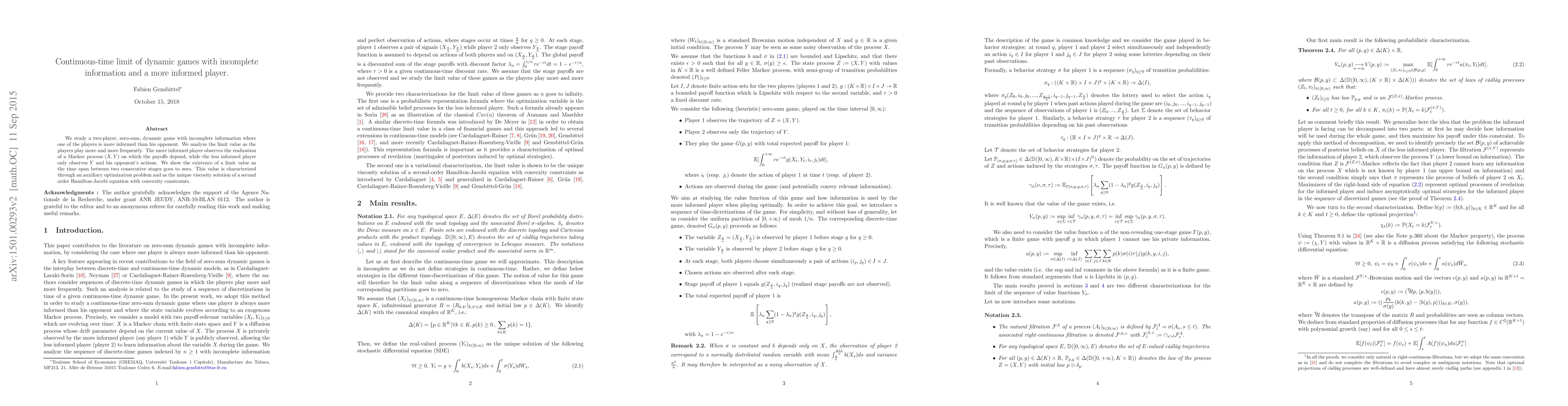 This research establishes the existence of a limit value in a dynamic two-player zero-sum game with incomplete information, where one player has more information. The limit is characterized via an optimization problem and as the unique viscosity solution of a specific Hamilton-Jacobi equation, with implications for understanding strategic interactions under information asymmetry.
