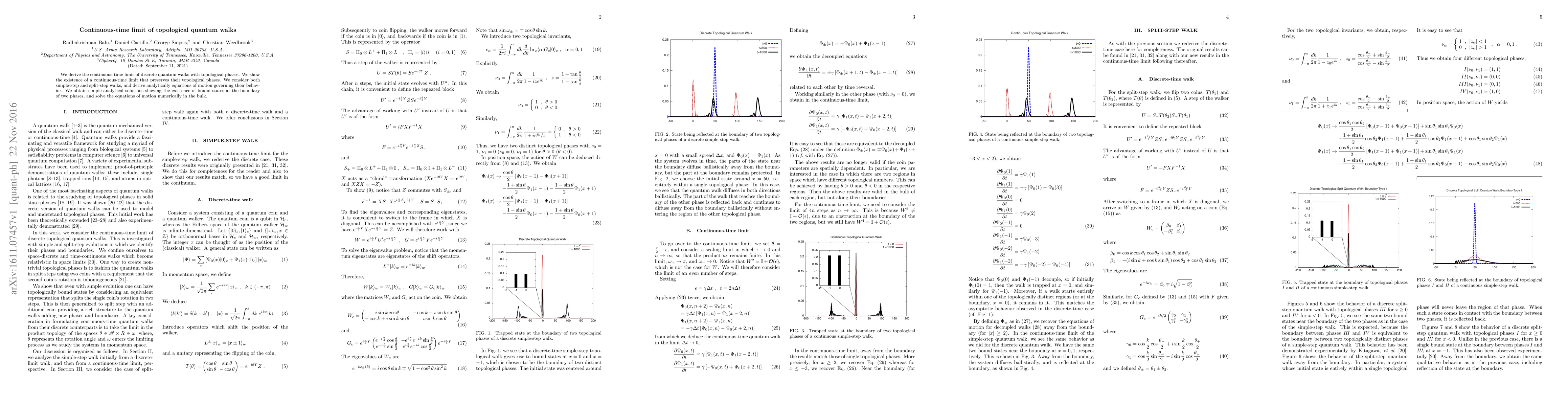 This paper derives the continuous-time limit of topological quantum walks, preserving their topological phases, and provides analytical equations of motion for both simple-step and split-step walks. It demonstrates the existence of bound states at the boundary between phases and solves the equations numerically in the bulk.