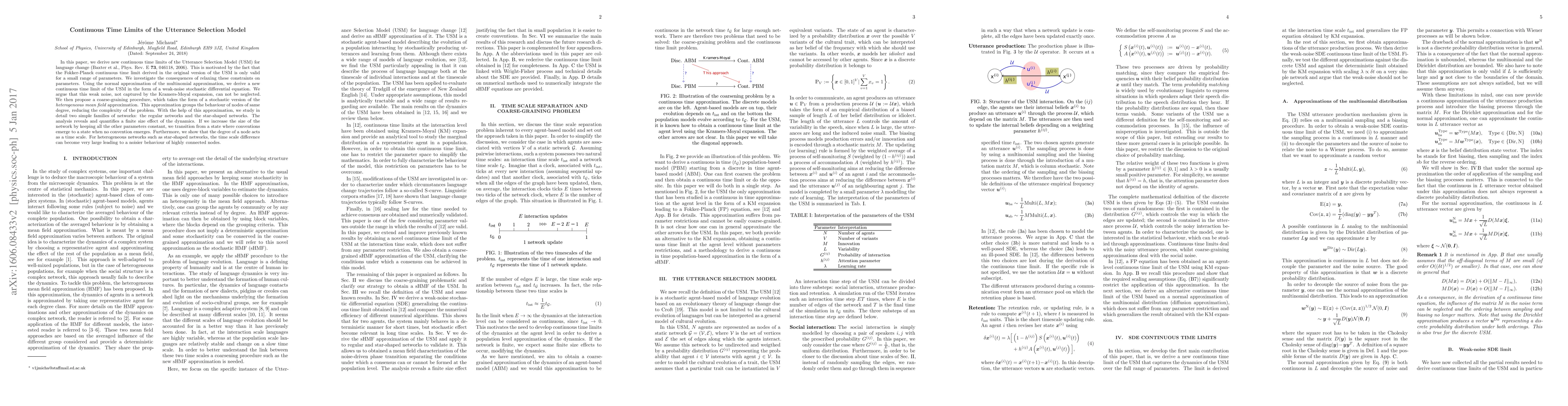 In this paper, we derive new continuous time limits of the Utterance Selection Model (USM) for language change (Baxter et al., Phys. Rev. E {\bf 73}, 046118, 2006). This is motivated by the fact that the Fokker-Planck continuous time limit derived in the original version of the USM is only valid for a small range of parameters. We investigate the consequences of relaxing these constraints on parameters. Using the normal approximation of the multinomial approximation, we derive a new continuous time limit of the USM in the form of a weak-noise stochastic differential equation. We argue that this weak noise, not captured by the Kramers-Moyal expansion, can not be neglected. We then propose a coarse-graining procedure, which takes the form of a stochastic version of the \emph{heterogeneous mean field} approximation. This approximation groups the behaviour of nodes of same degree, reducing the complexity of the problem. With the help of this approximation, we study in detail two simple families of networks: the regular networks and the star-shaped networks. The analysis reveals and quantifies a finite size effect of the dynamics. If we increase the size of the network by keeping all the other parameters constant, we transition from a state where conventions emerge to a state when no convention emerges. Furthermore, we show that the degree of a node acts as a time scale. For heterogeneous networks such as star-shaped networks, the time scale difference can become very large leading to a noisier behaviour of highly connected nodes.