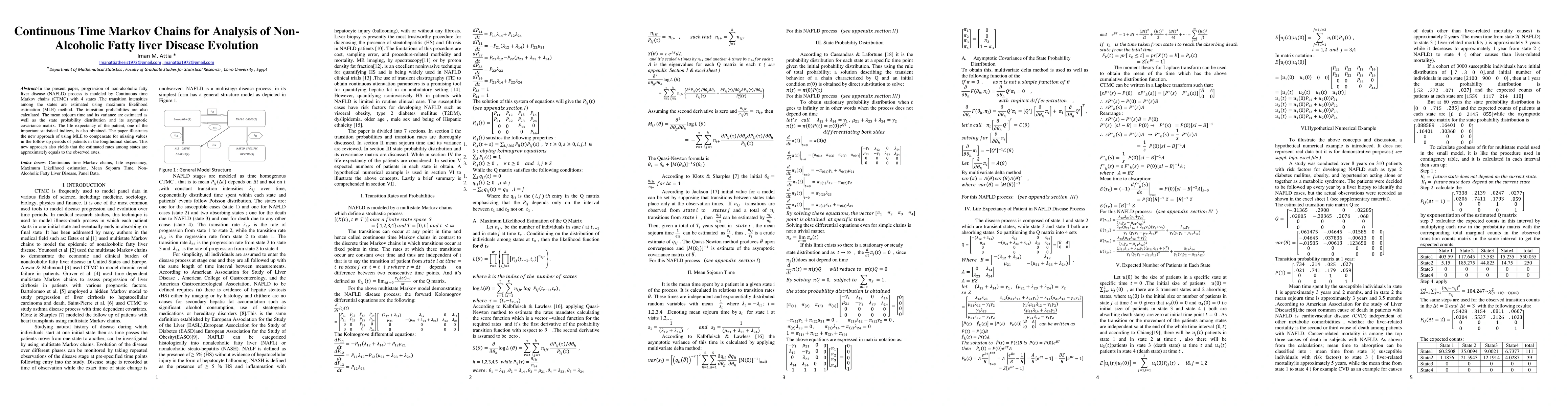 In the present paper, progression of non-alcoholic fatty liver disease (NAFLD) process is modeled by Continuous time Markov chains (CTMC) with 4 states .The transition intensities among the states are estimated using maximum likelihood estimation (MLE) method. The transition probabilities are also calculated. The mean sojourn time and its variance are estimated as well as the state probability distribution and its asymptotic covariance matrix. The life expectancy of the patient, one of the important statistical indices, is also obtained. The paper illustrates the new approach of using MLE to compensate for missing values in the follow up periods of patients in the longitudinal studies. This new approach also yields that the estimated rates among states are approximately equals to the observed rates.