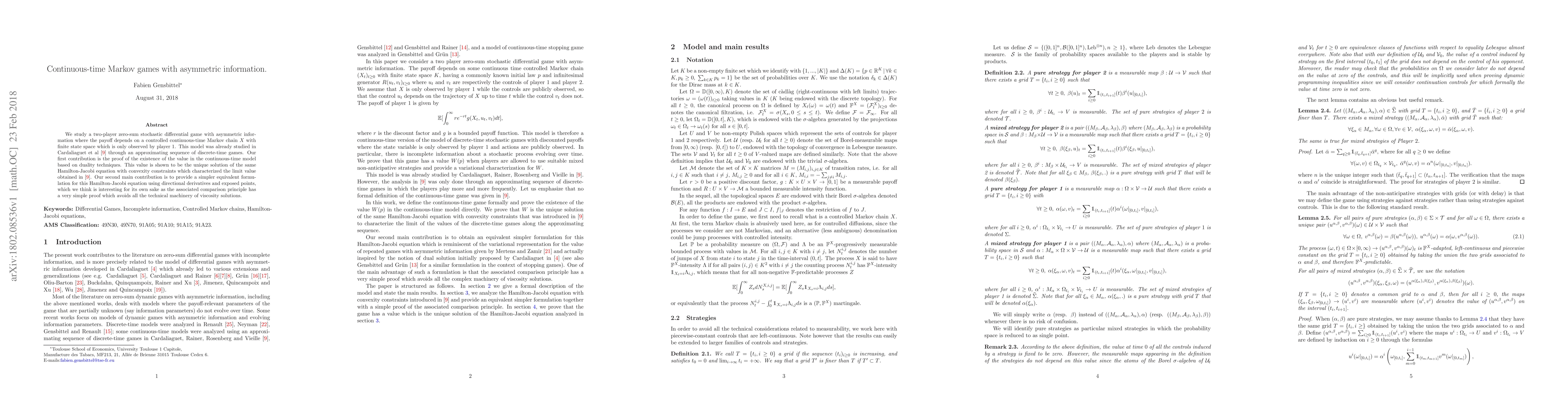 This research proves the existence of the value in a continuous-time Markov game with asymmetric information, using duality techniques. It also presents a simplified equivalent formulation for the Hamilton-Jacobi equation, offering a comparison principle with a straightforward proof.