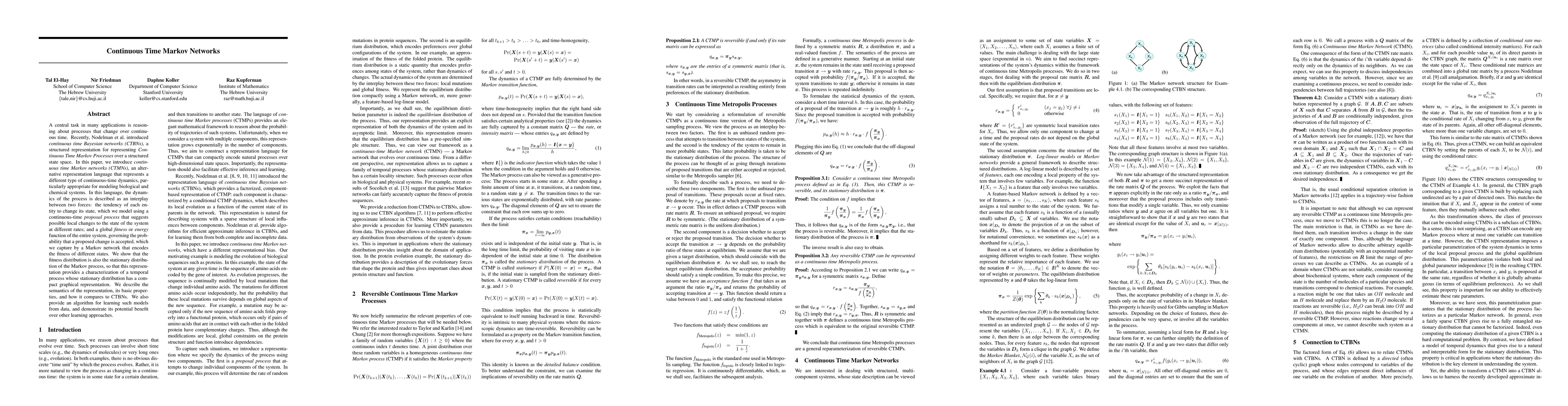 This paper introduces continuous time Markov networks (CTMNs) as an alternative representation for modeling continuous-time processes, contrasting them with continuous time Bayesian networks (CTBNs). CTMNs describe processes through a proposal process and a Markov network that captures the fitness of states, enabling the modeling of complex dynamics in biological and chemical systems.