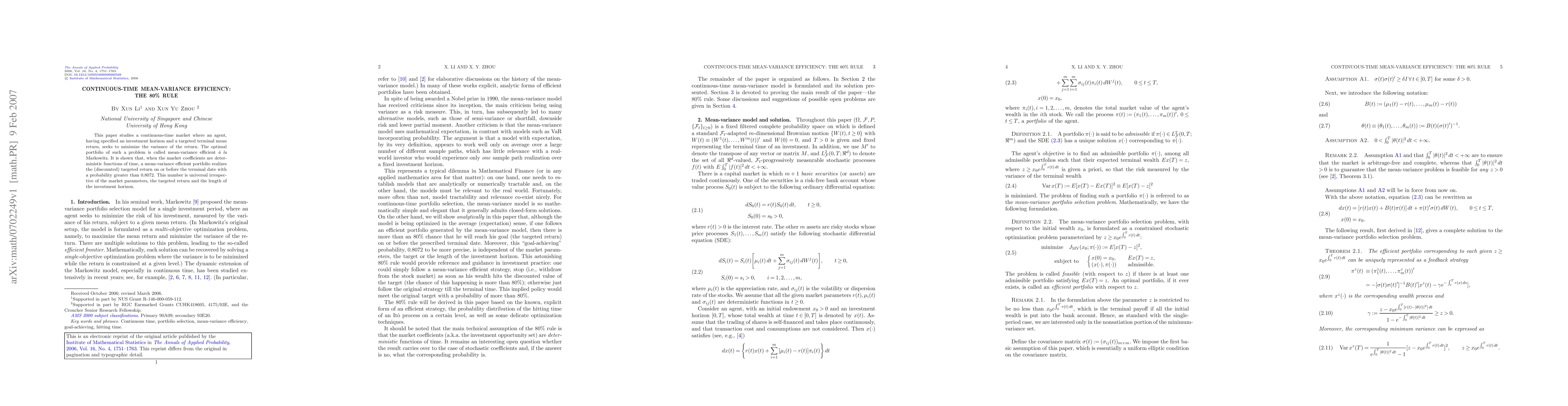 A study shows that in a continuous-time market, a mean-variance efficient portfolio meets its target return with over 80% probability within the specified investment horizon. This finding is universal across different market parameters and conditions.
