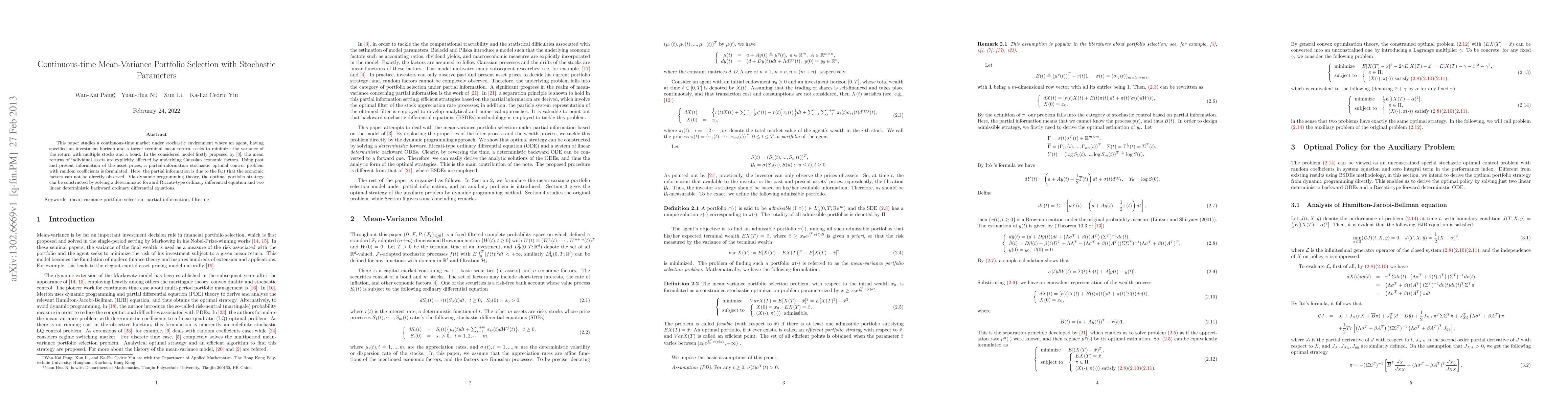 Researchers developed a model to optimize portfolio selection in continuous-time markets with stochastic parameters, minimizing variance while meeting target return goals. They used dynamic programming theory to solve equations derived from asset price movements and economic factors.